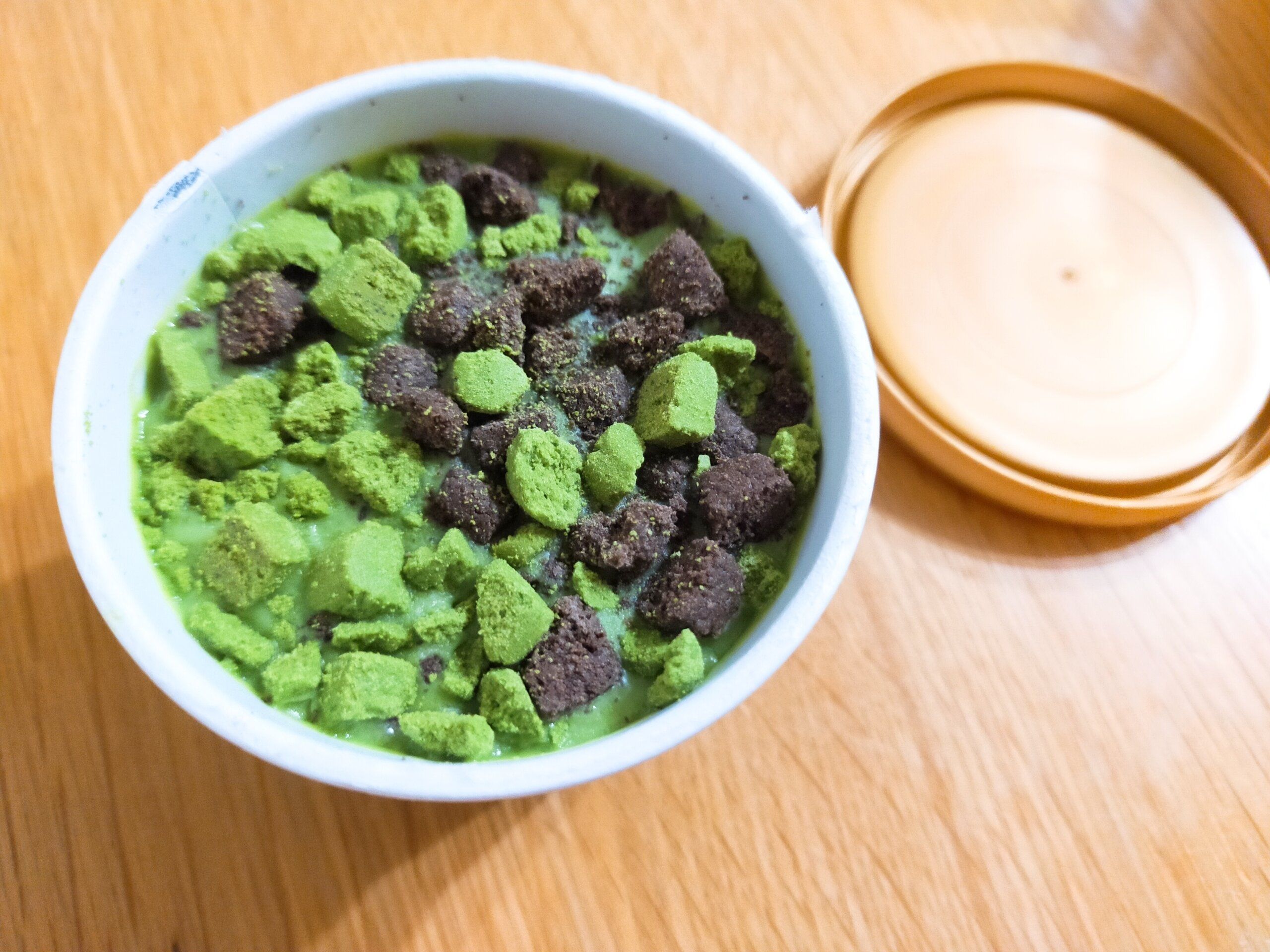 抹茶とココアのクッキーが所狭しとデコレーションされています。上品な甘さの抹茶アイスクリームにコーティングされているのは、チョコレートソース。
