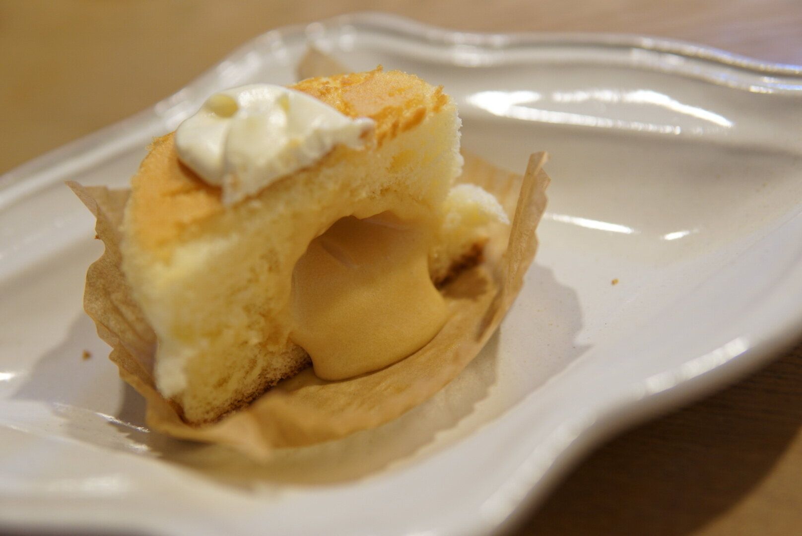 柔らかさに苦戦しながら半分にカットすると、中からとろっと溢れ出てくる焦がしバターソース。こちらは、とろっと、でもねっとりとしたキャラメルのようなお味。