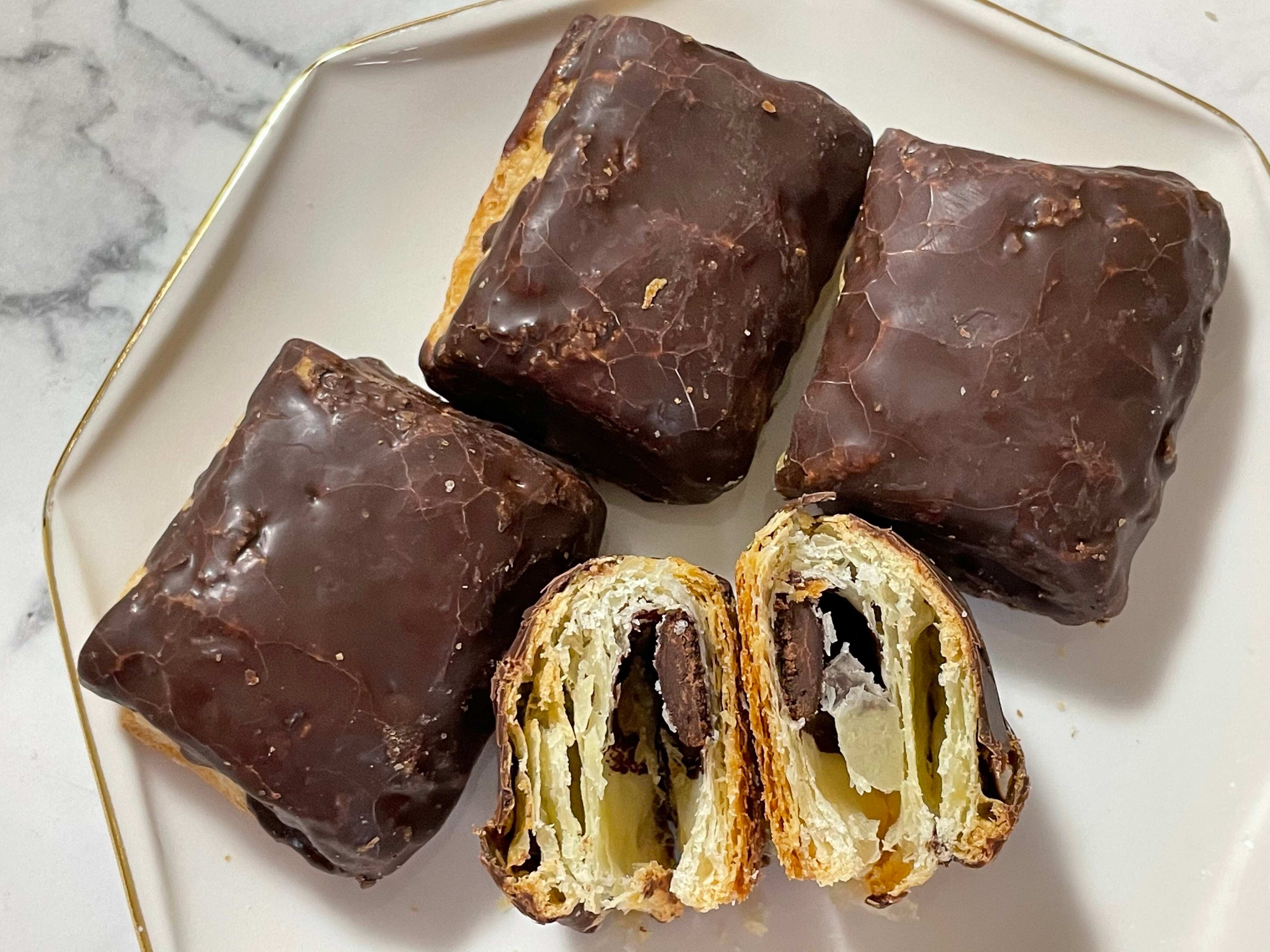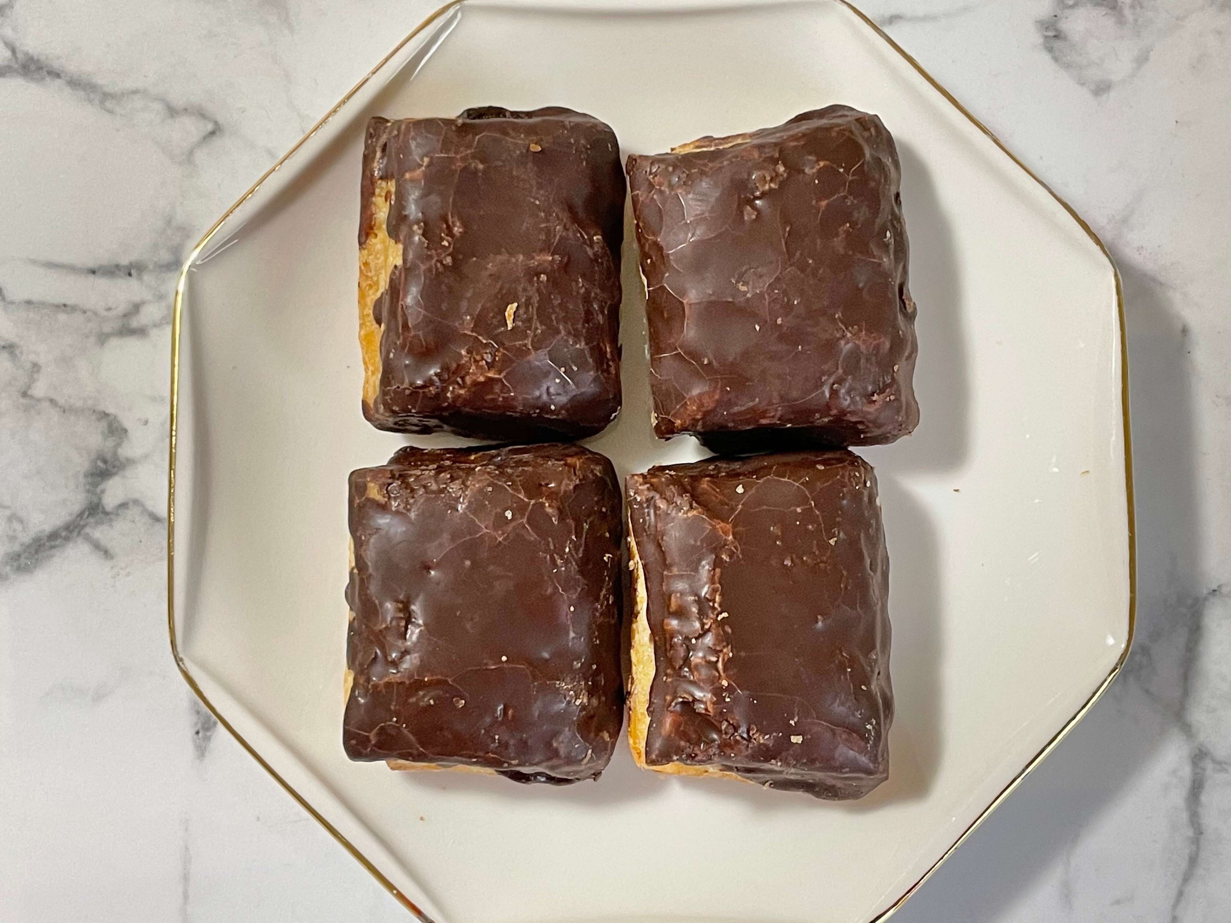 さっくりとした食感のパイ生地でチョコクリームを包み、更にチョコレートでコーティングされています。一口サイズで4個入っています。