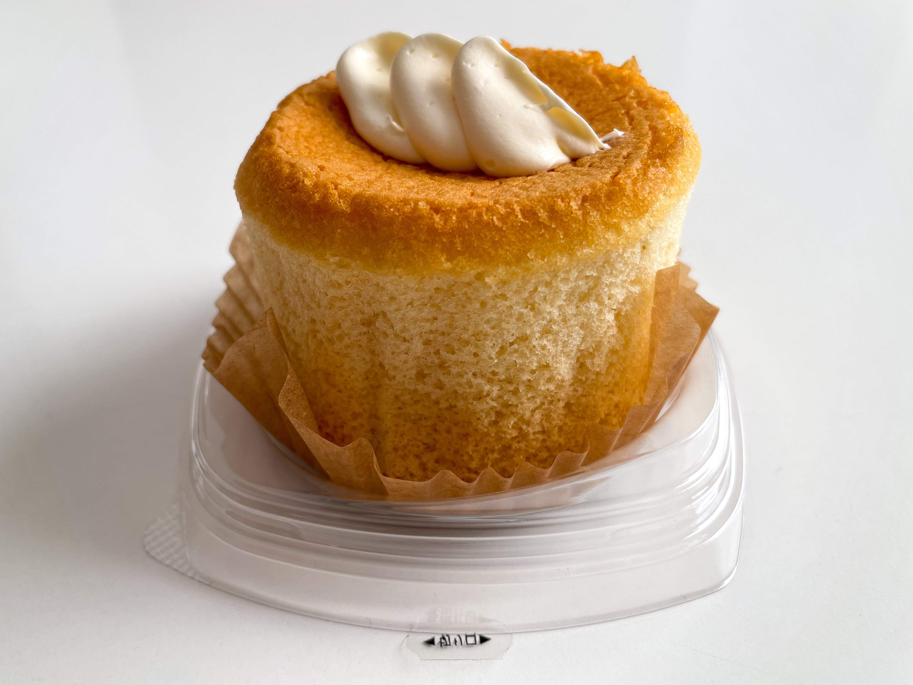 パッケージの蓋を開けてみると、キレイに焼かれたシフォンケーキの上に生クリームのようなバタークリームがトッピングされています。