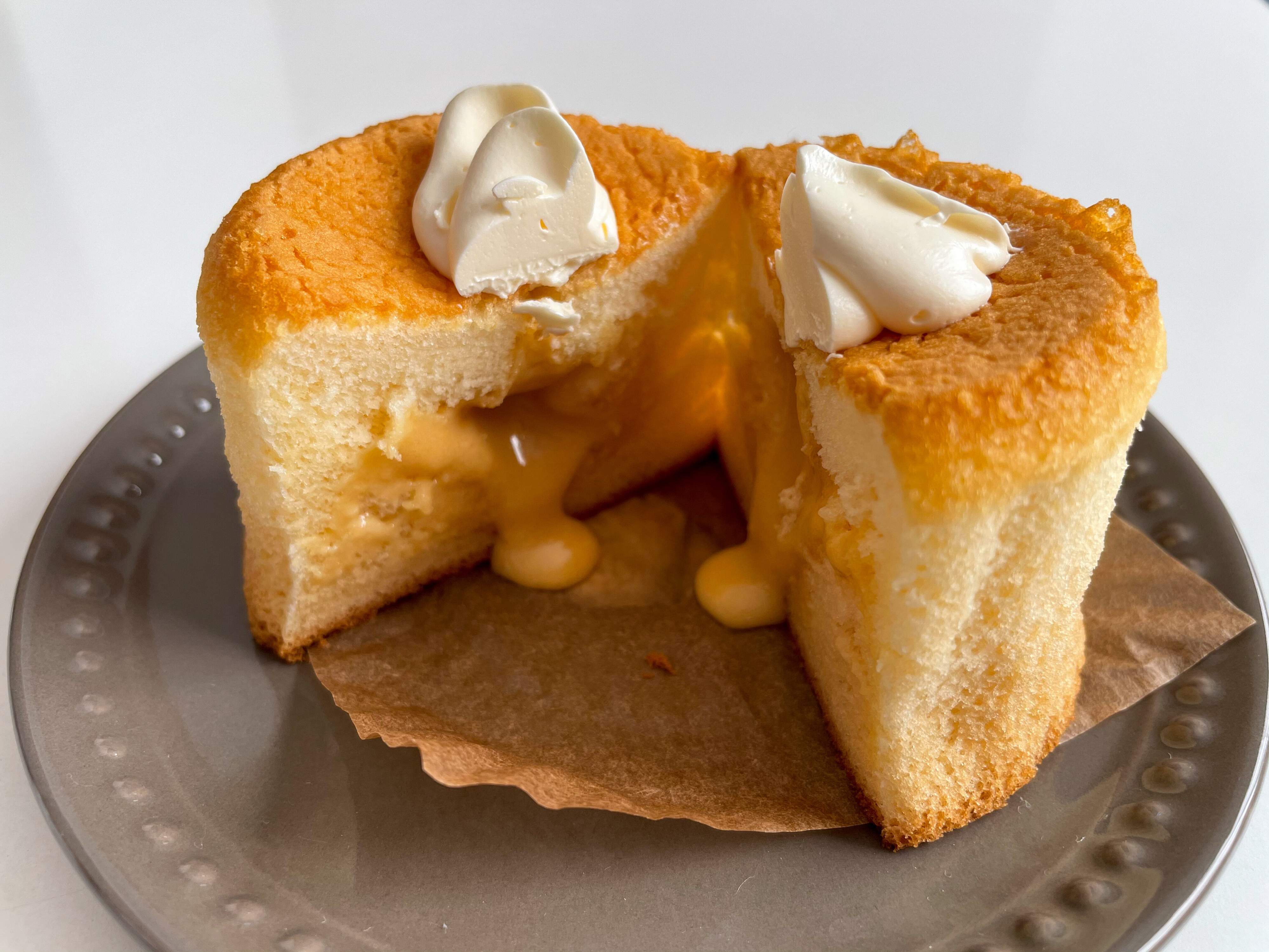 中から焦がしバターソースがとろっと溢れ出てきます。焦がしバターソースは、スポンジにも染み込んでいてとても美味しそうです。