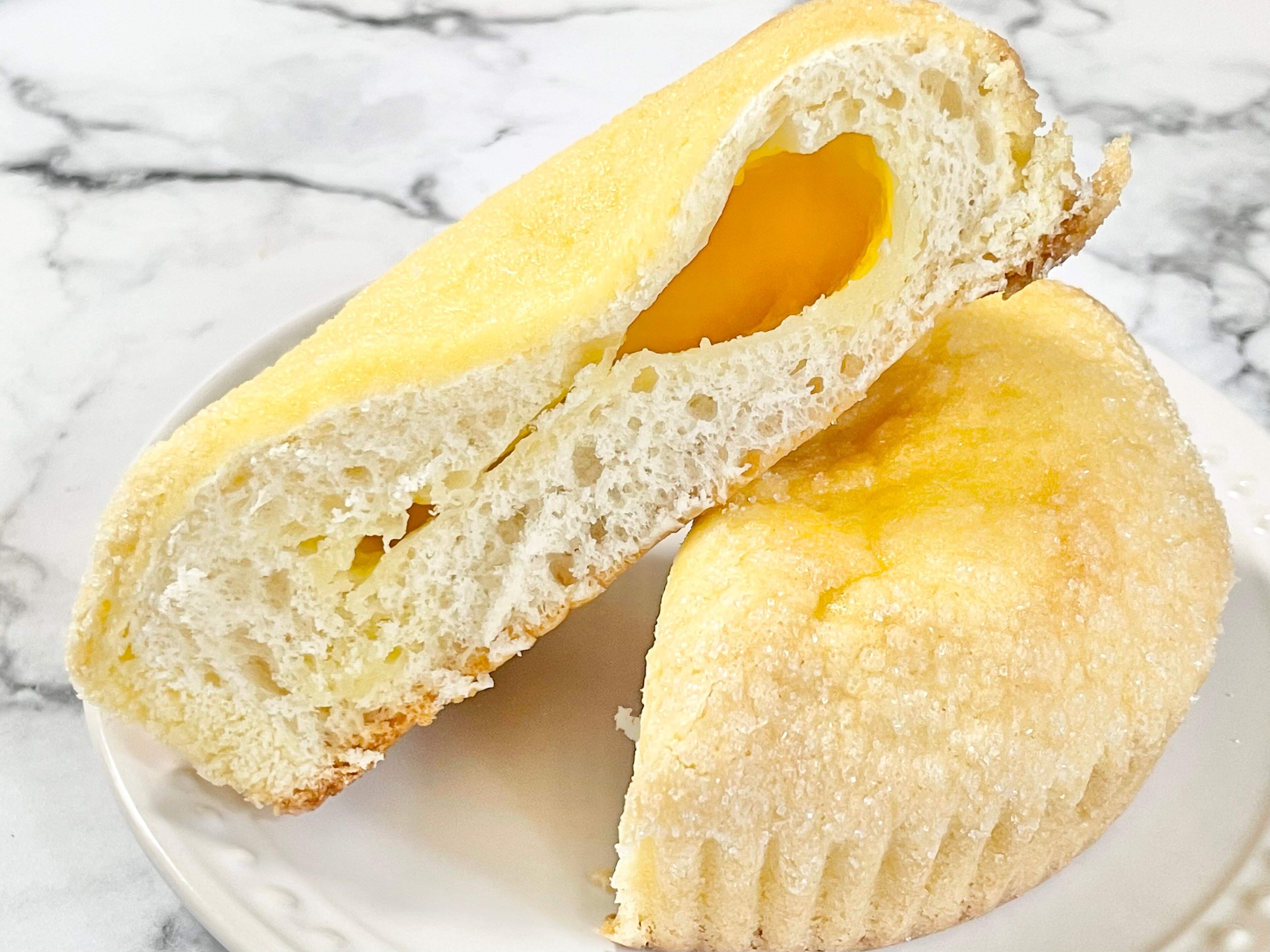 「なんかメロンパンぽくない……」と感じますが、その理由はおそらく、格子状の模様がなく、真ん中がくぼんでいるから。