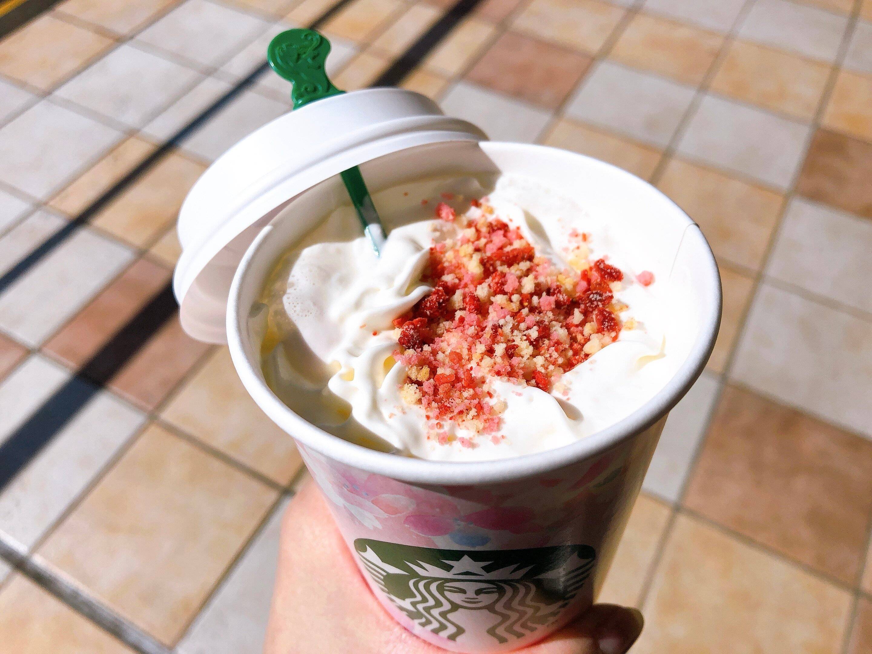 さくらストロベリーソースをミルクで割り、ホイップクリームの上には桜ストロベリーのトッピングがかわいらしく乗っています。