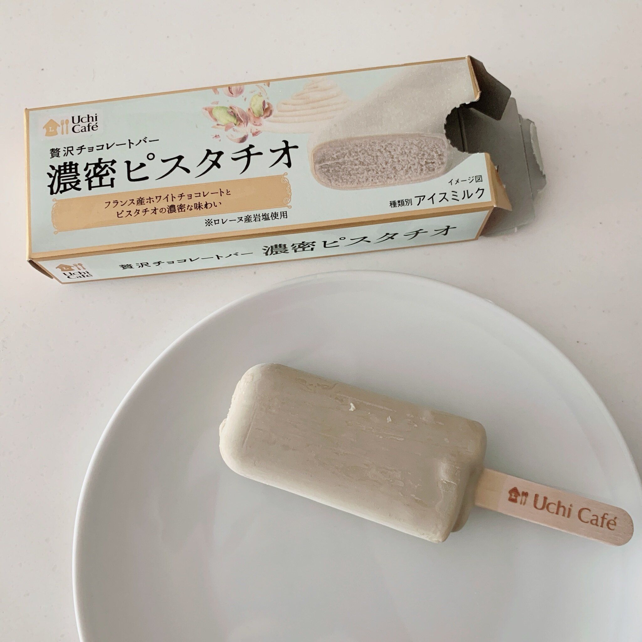 フランス産のホワイトチョコレートでコーティングされたバータイプのピスタチオアイス。昨年も販売され、大人気だった商品です。