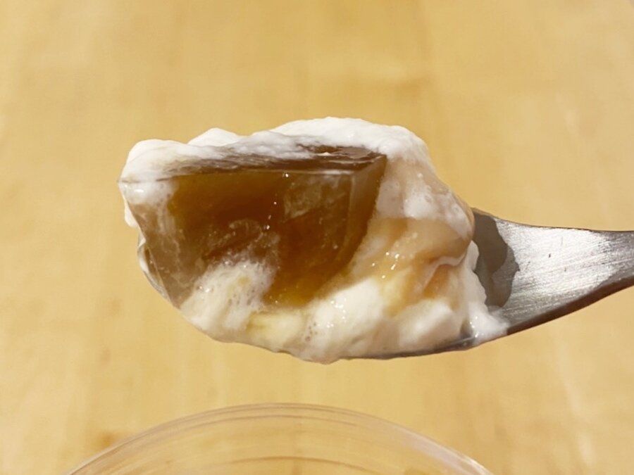 下からほうじ茶ミルクプリン、ほうじ茶ゼリー、ホイップクリームの層になっています。