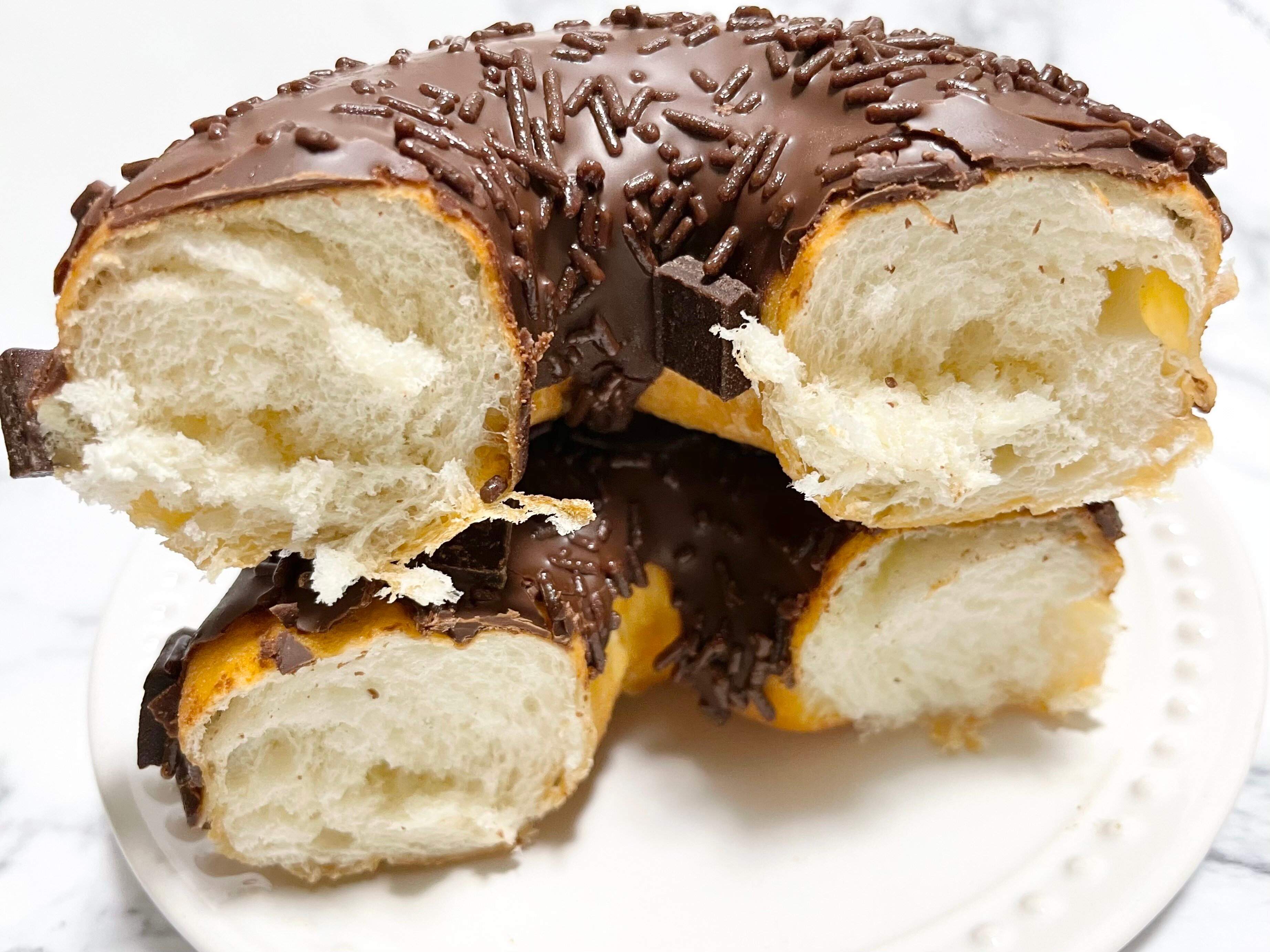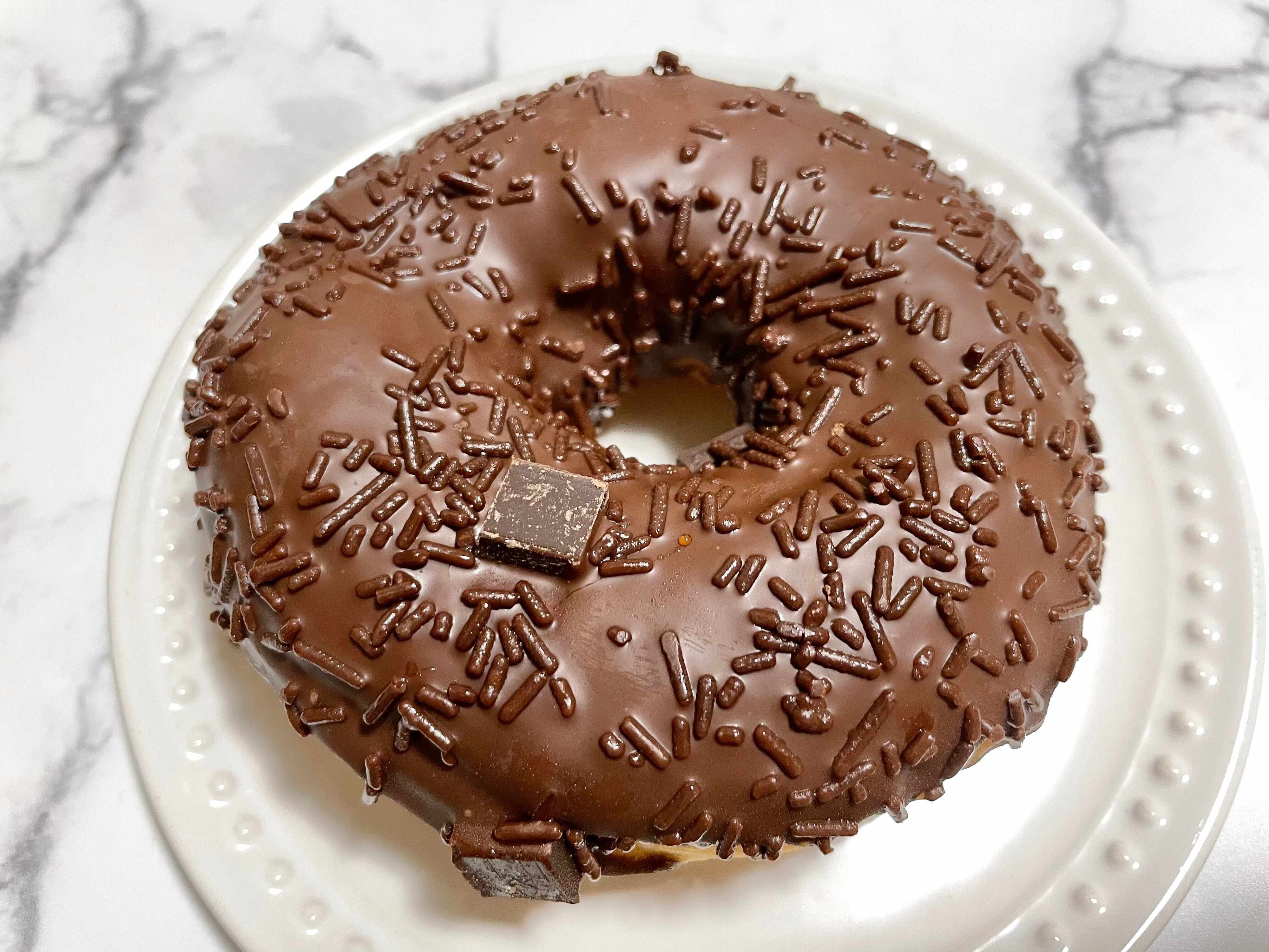 チョコレートが3種類のっているわりにはビターな仕上がりになっていて、驚きました。スクエアチョコがカリッとしてアクセントになっていますね。チョコスプレーは生地全体にかかっているチョコレートと馴染んでいて主張控えめでした。