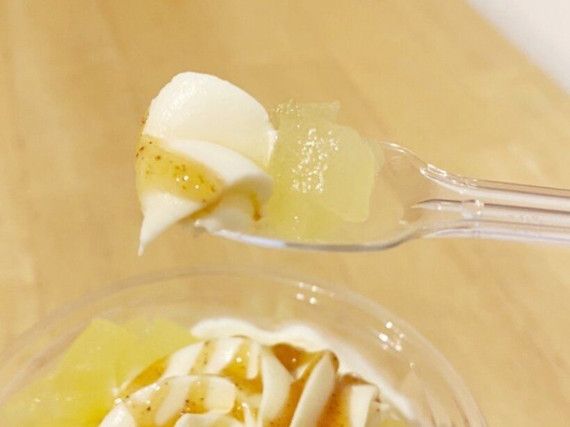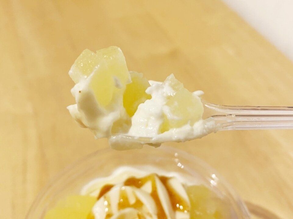 最上部にトッピングされたりんご果肉は、シャキシャキ食感で上品な甘さです。なめらかな舌ざわりでチーズの味が濃厚なチーズホイップと、シナモンの風味豊かな甘いカラメルソースとの相性は抜群◎。