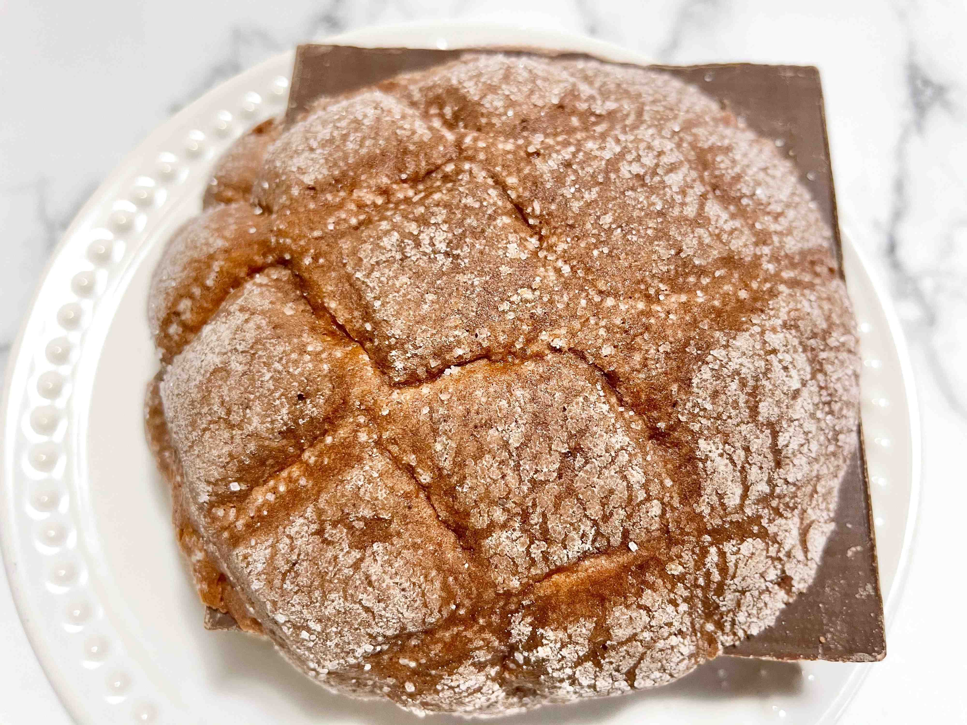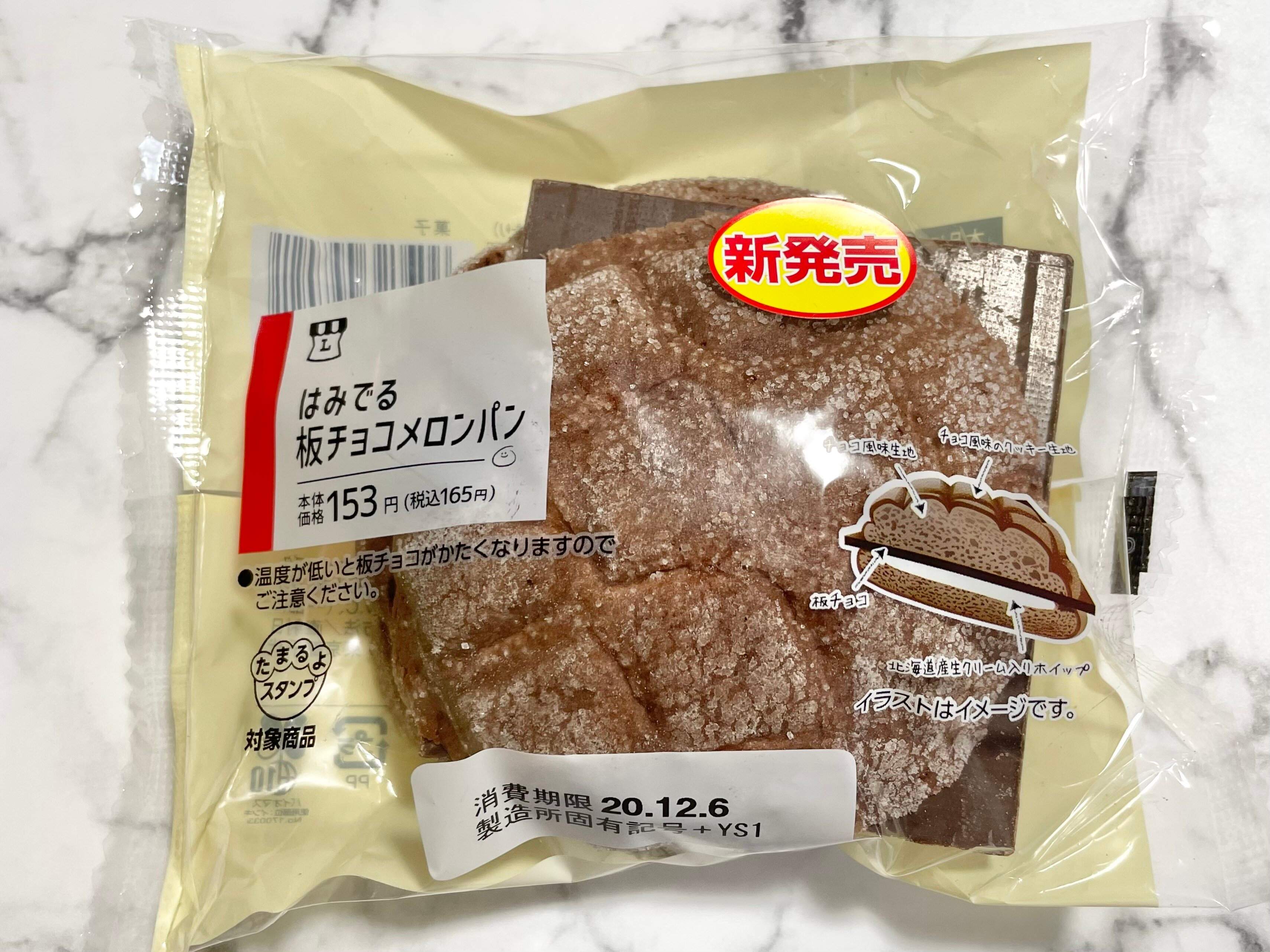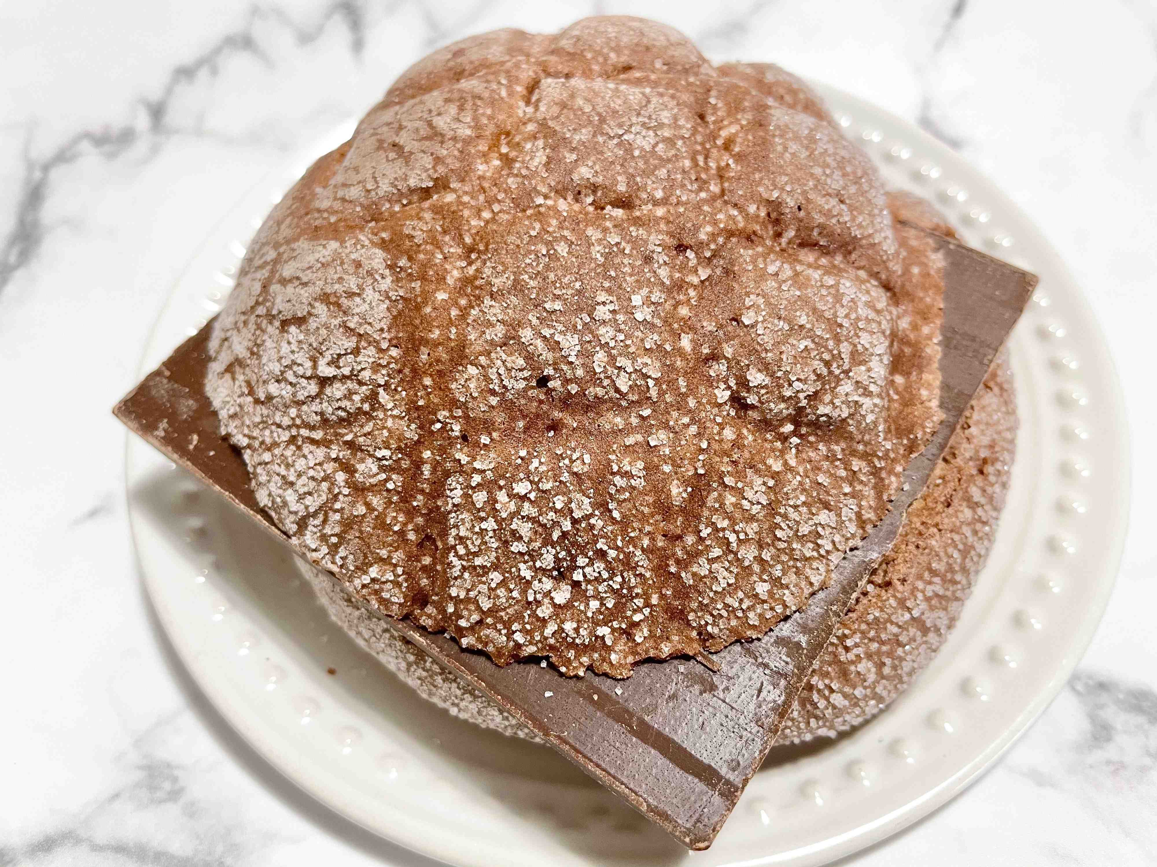 板チョコがチョコ風味のメロンパンからはみでてるのが見えてます。しかも結構はみでててチョコ好きにはたまりません。