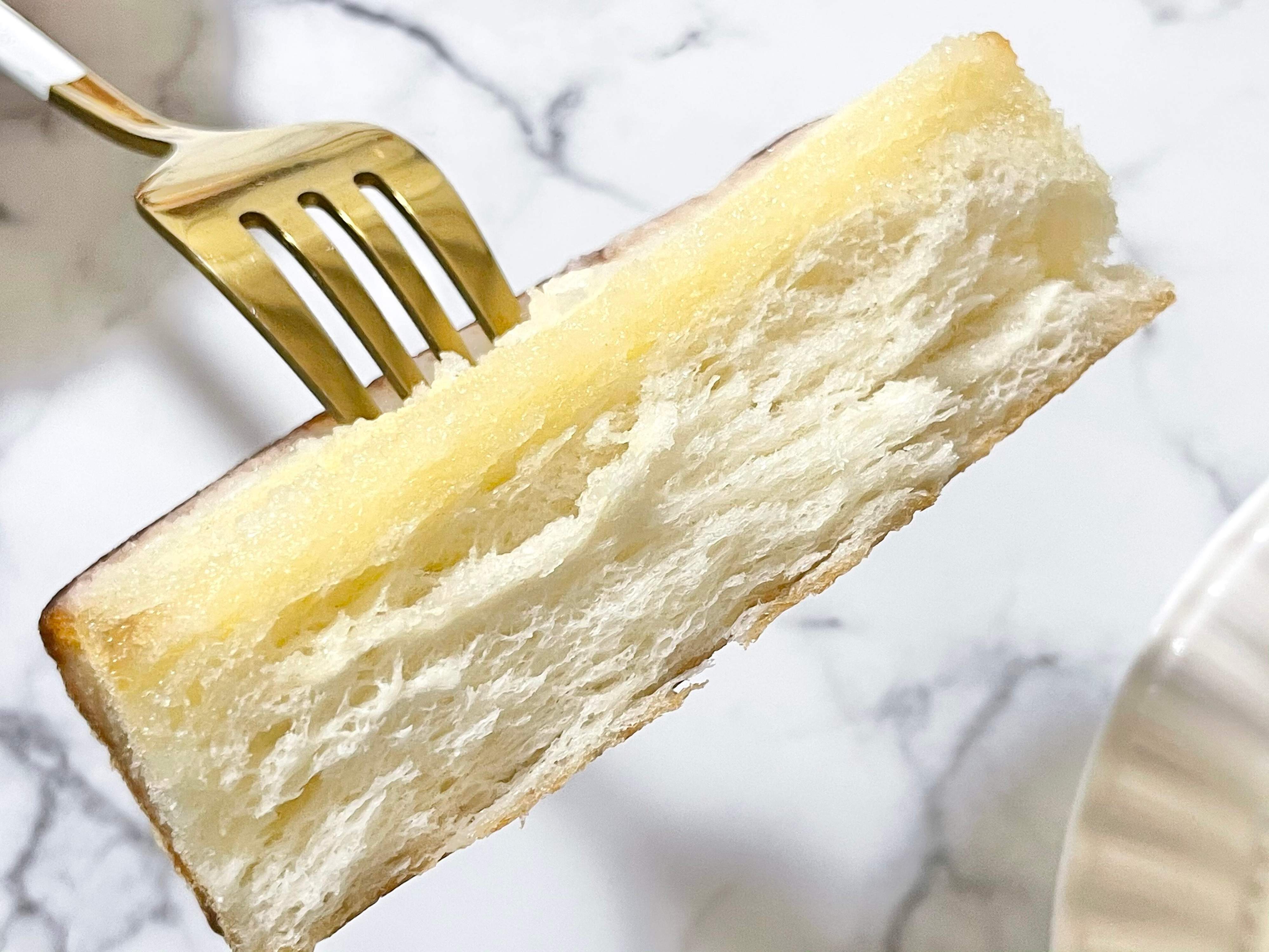 そのままだとややパサつきが気になったのと、「やっぱりトーストは温めたほうがおいしいでしょ!」ということで、600Wの電子レンジで20秒ほど温めてから食べたら……パンがしっとりもっちり。