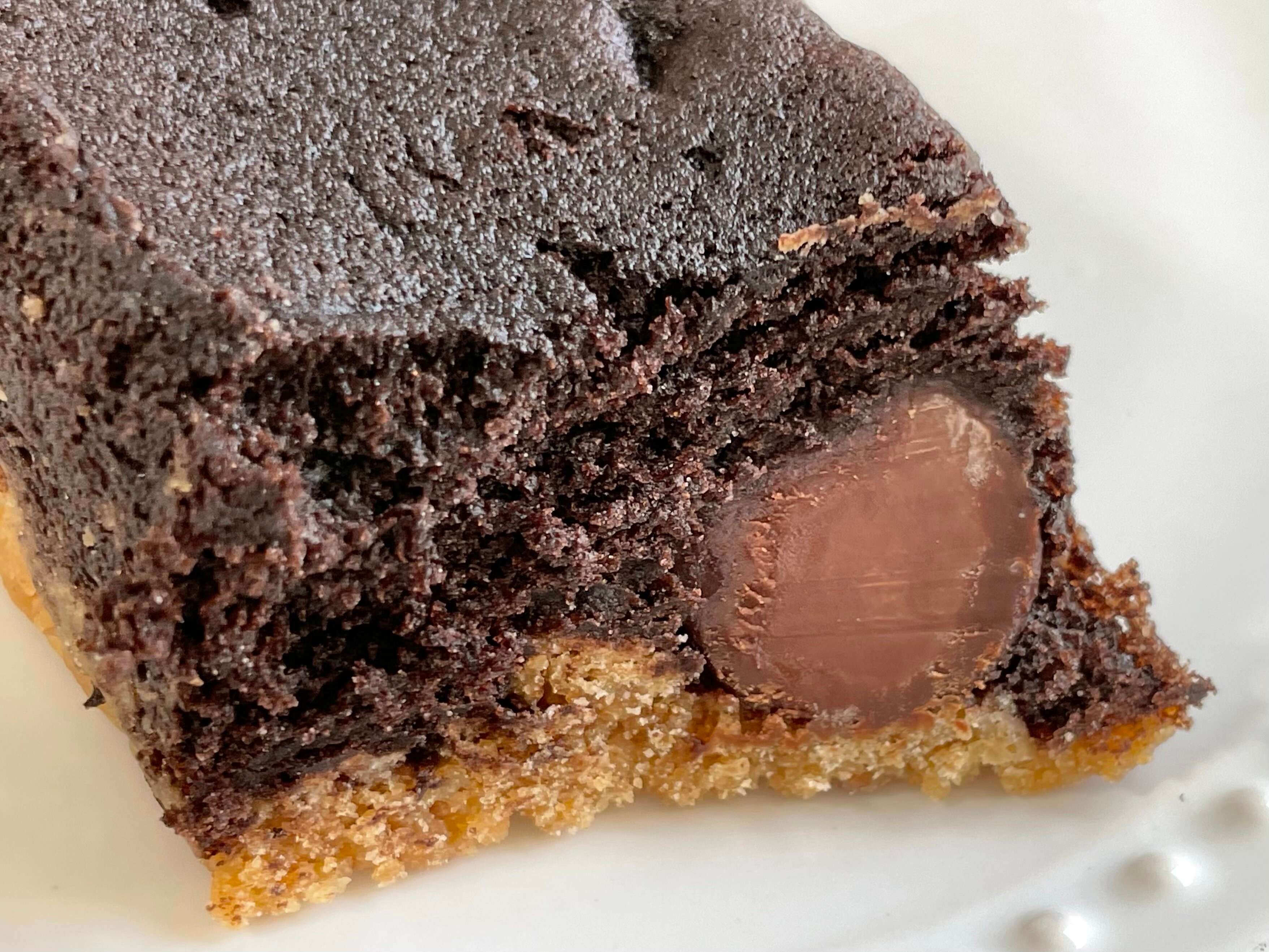 生クリーム、ココアを配合したしっとりとした食感のチョコ生地に、チョコタブレットと、隠し味にコーヒーを配合したくるみ入りタルト生地を合わせた商品。もはやパンではないけど、パン屋さんにありそうなので良しとします。