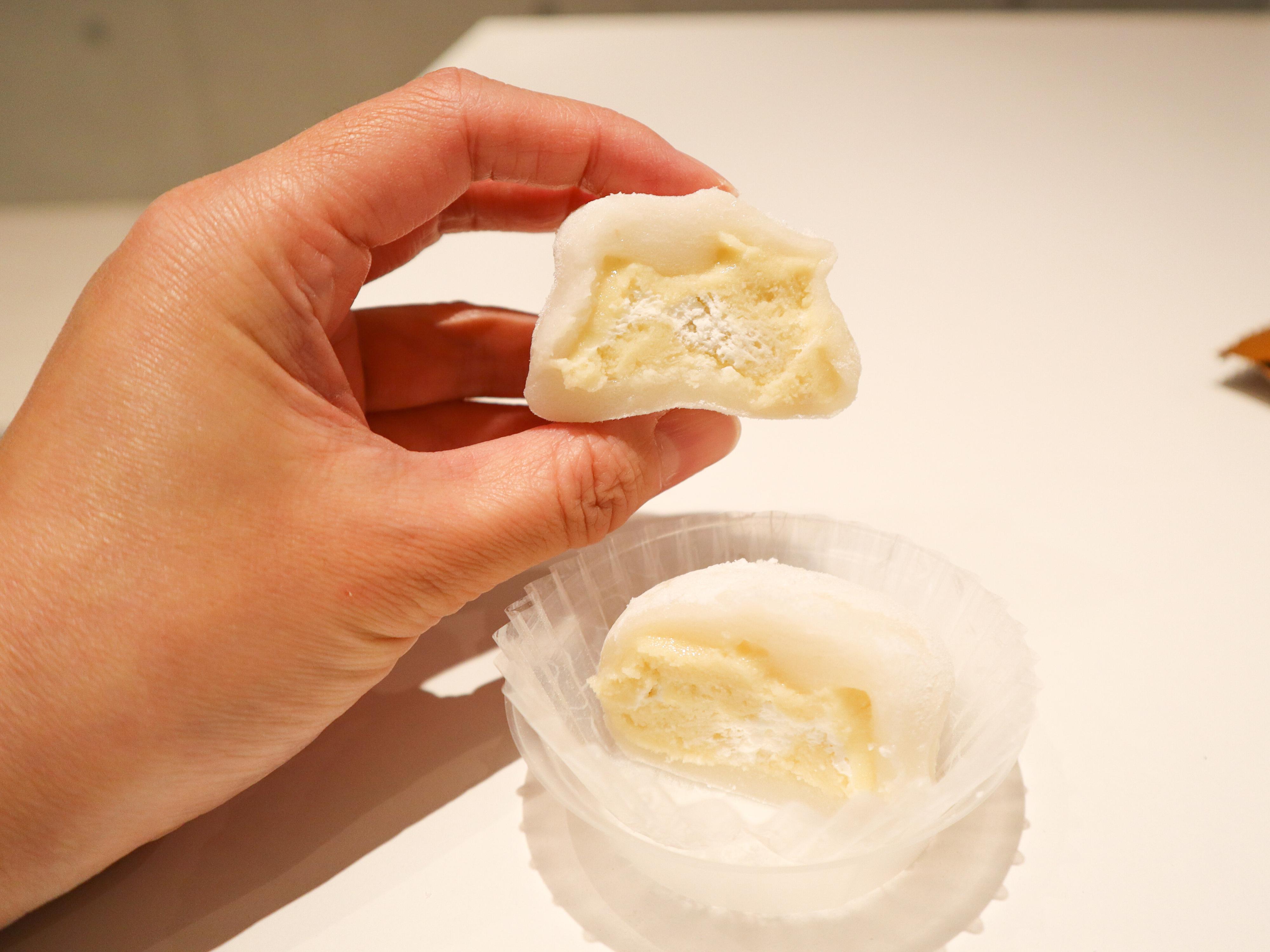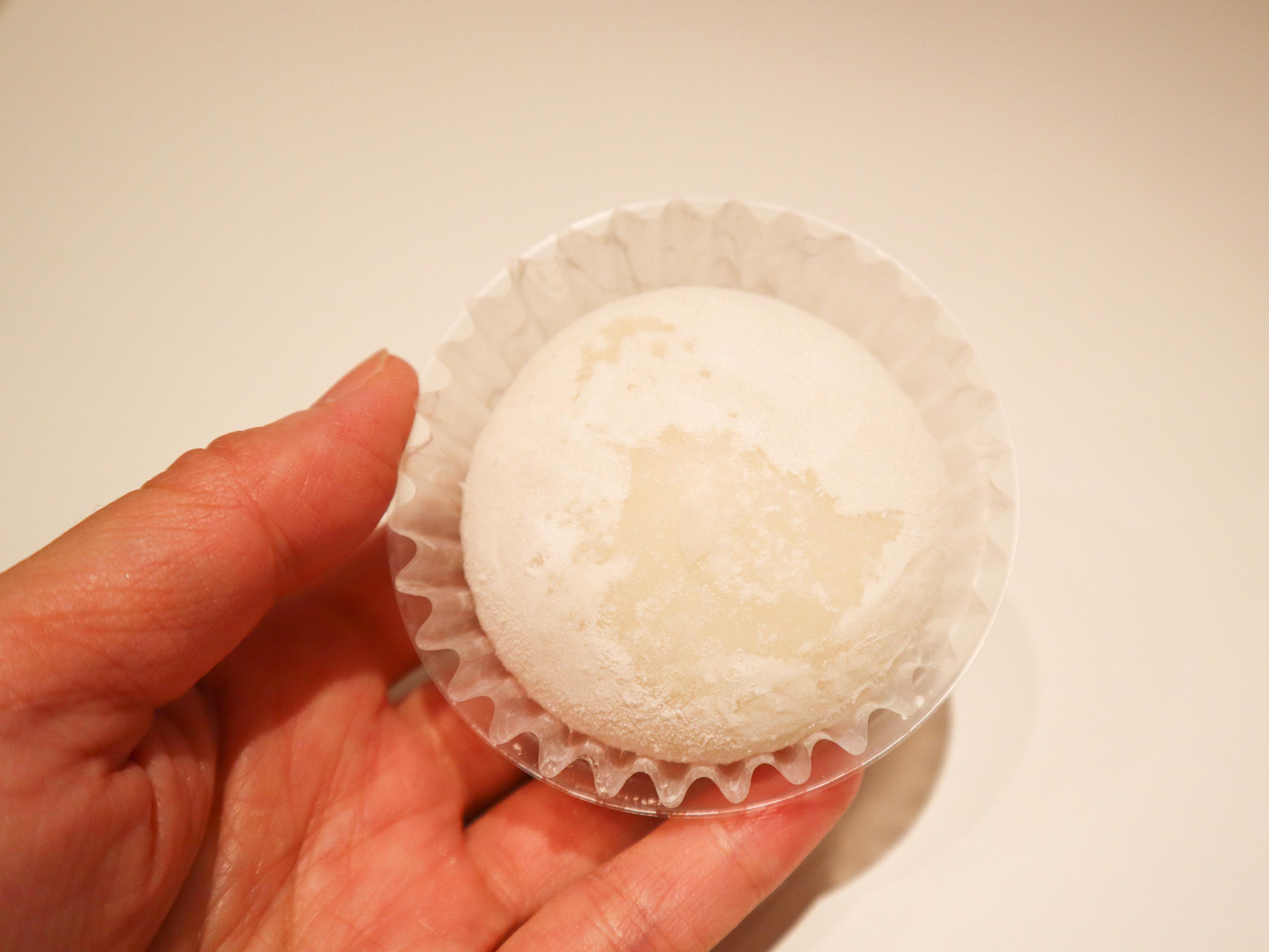 袋から取り出してみると、手の先にのる小さめサイズの大福です。いざ手で掴んでみると、さすが生食感。大福の生地がとろけるような柔らかさで指についてきます。