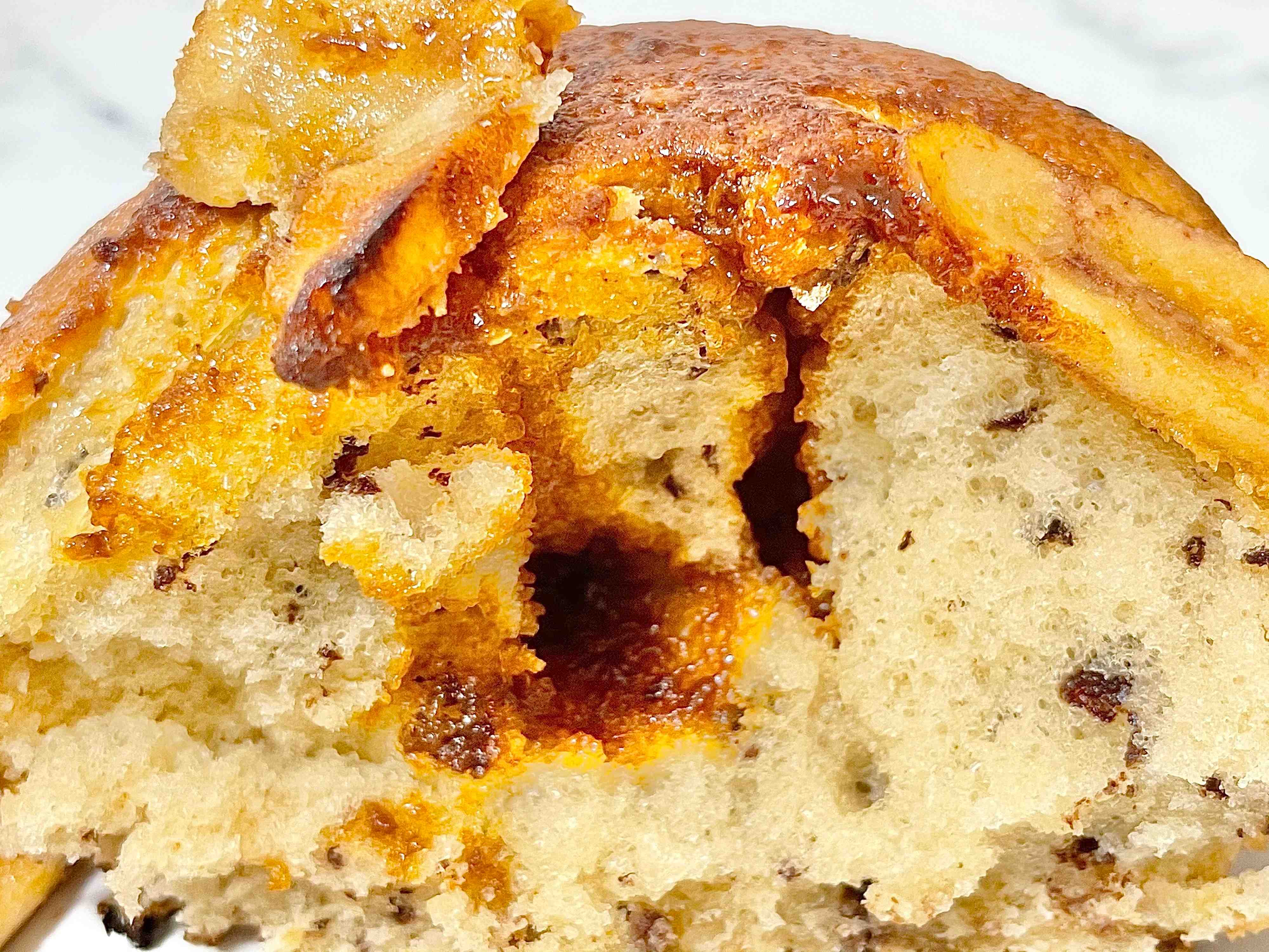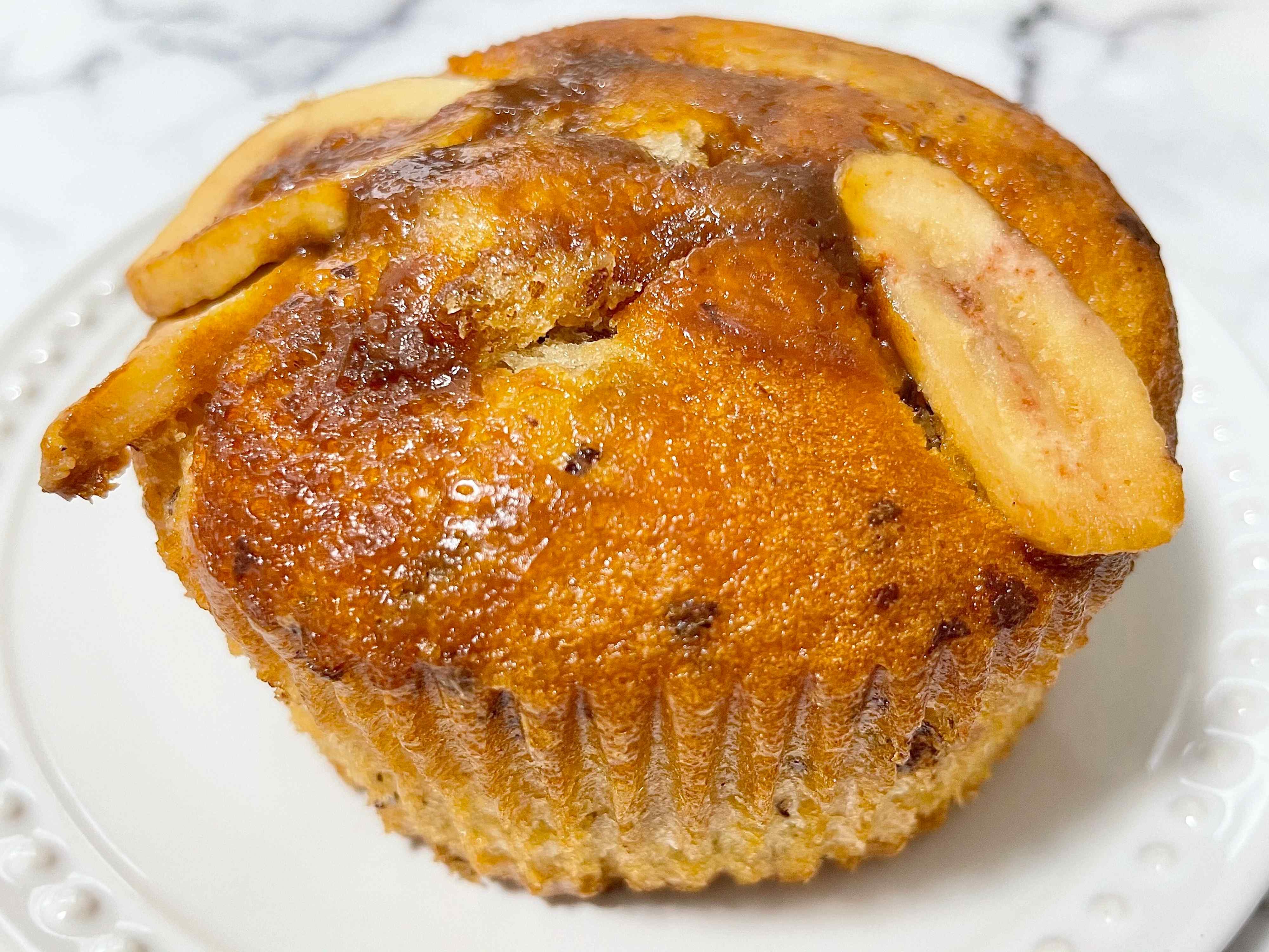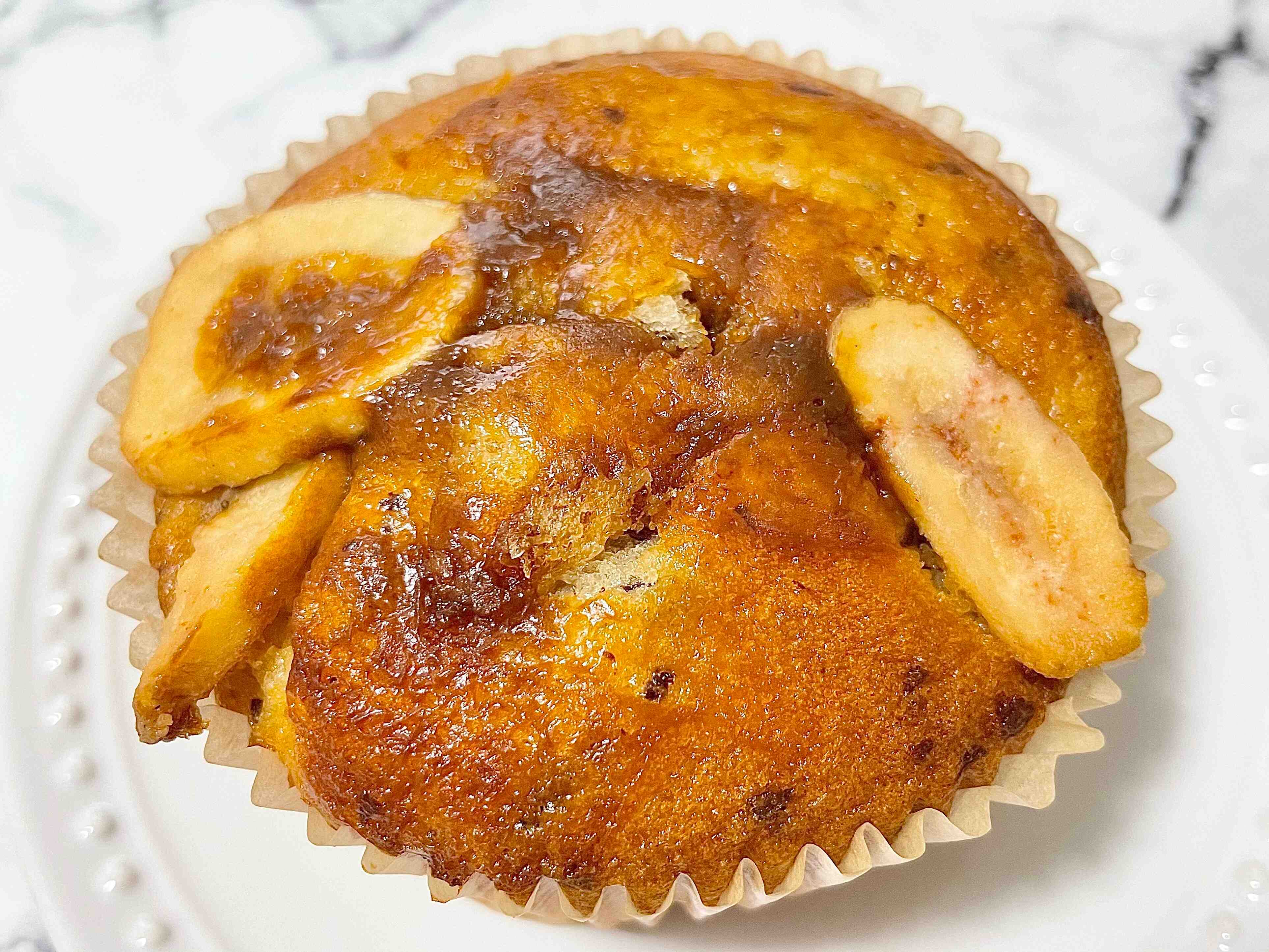 バナナだけでもおいしいのに今回は削りチョコとキャラメルソースが入っていて、バナナチップをただピンクしたしっとり食感のバナナマフィンに仕上がっています。