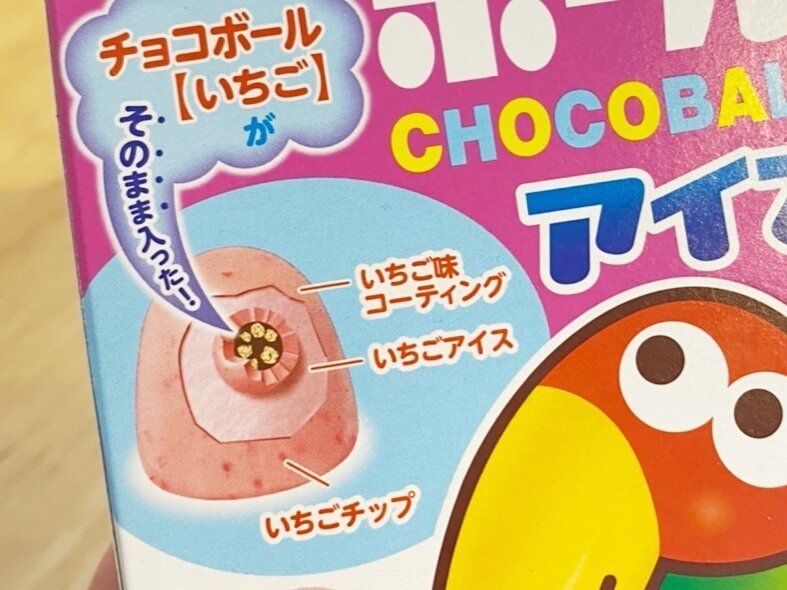 チョコボールのまわりにはいちご味のアイスクリーム、外側はパリパリのいちごチョコレートでコーティングされています。