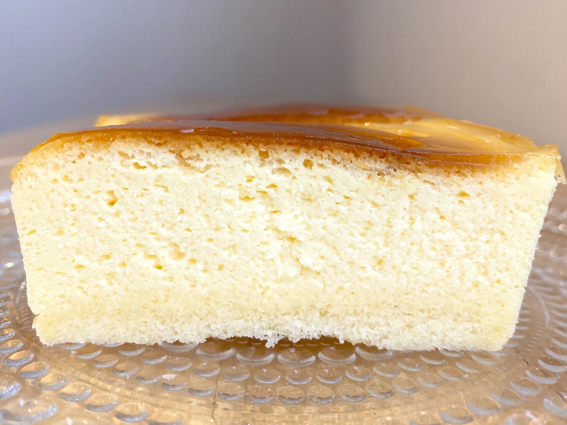袋からだして持ち上げてみるとずっしりと重みを感じます。天面はあんずシロップでコーティングされていて、ビジュアルからは昔ながらのスフレチーズケーキの素朴さを感じます。