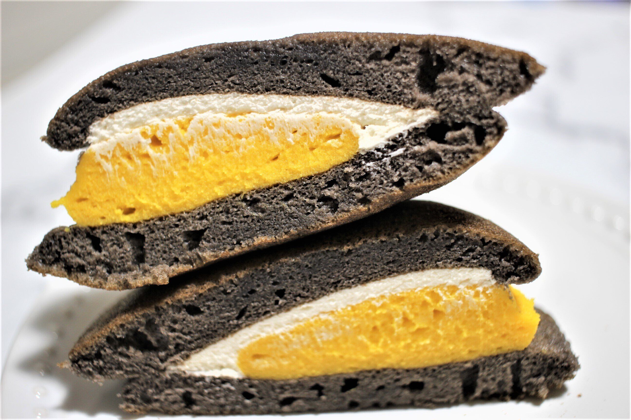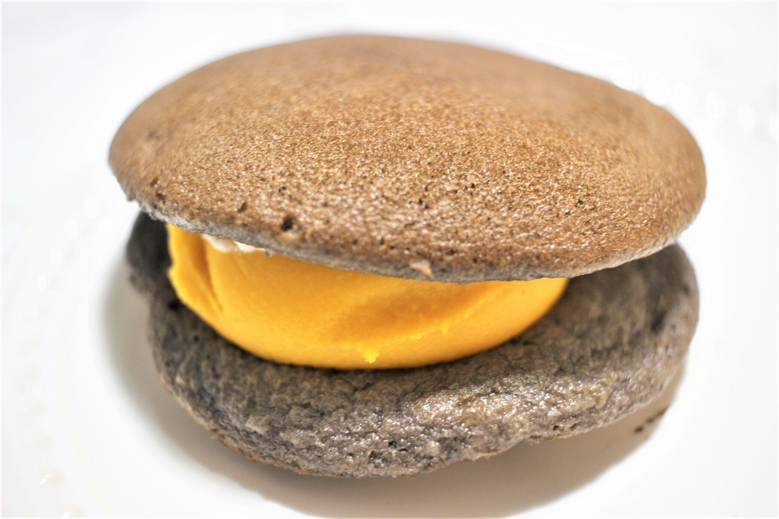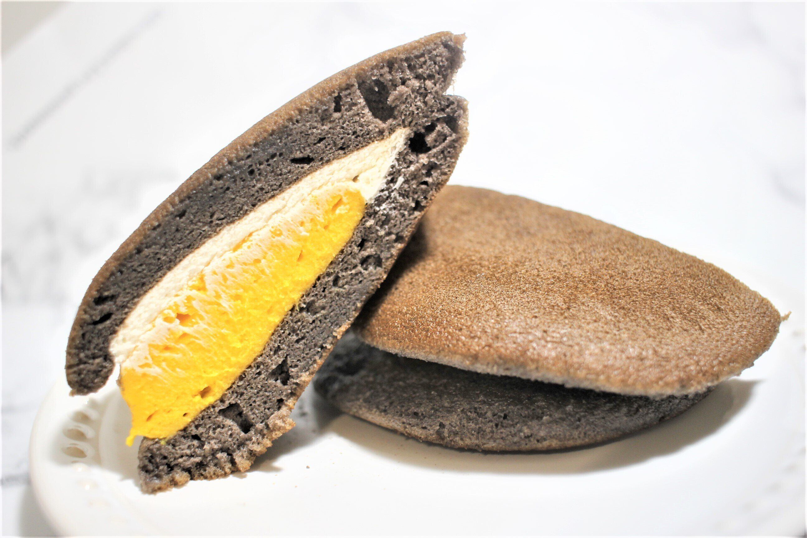 かぼちゃどらはかぼちゃクリームあんとホイップクリームを、ココア生地で挟んだどら焼きです。かぼちゃスイーツはたくさん見ますが、どら焼きはあまり見かけない気がします。