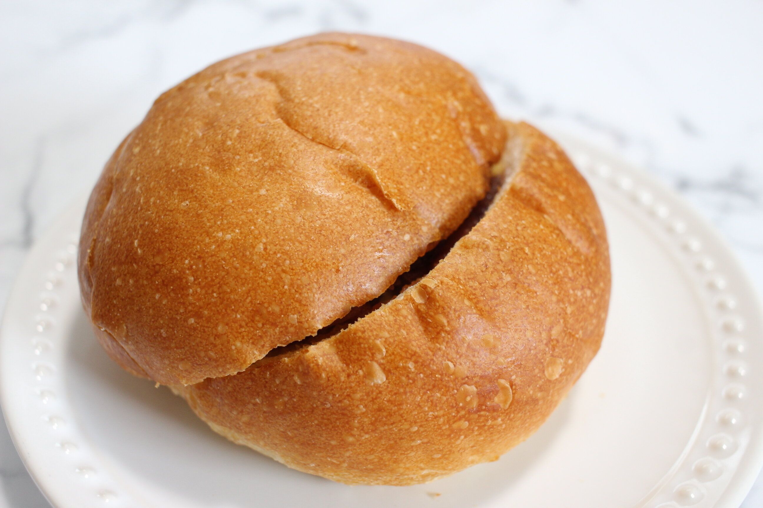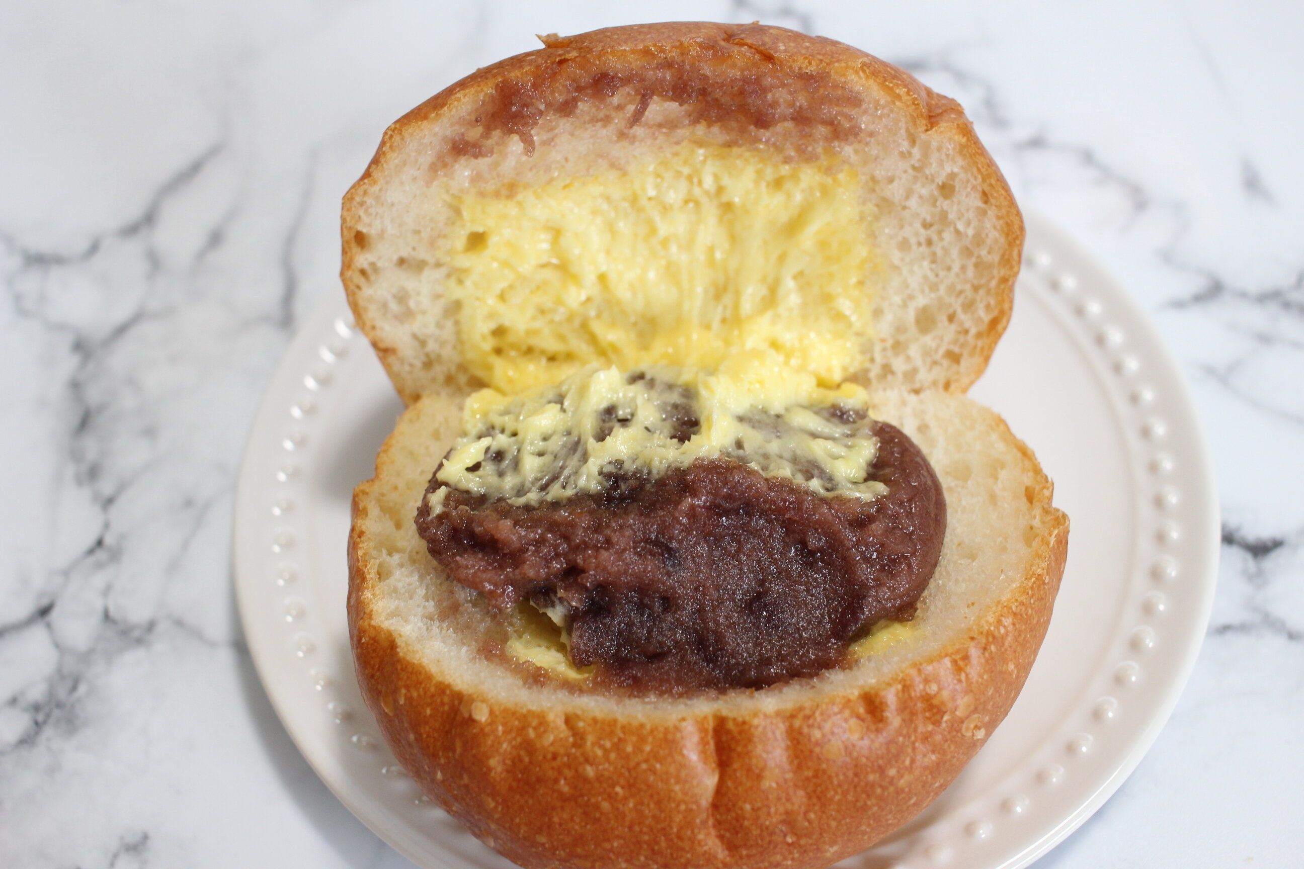 手のひらサイズで丸いフォルムが可愛いフランスパンにつぶあんとバターが挟まれています。