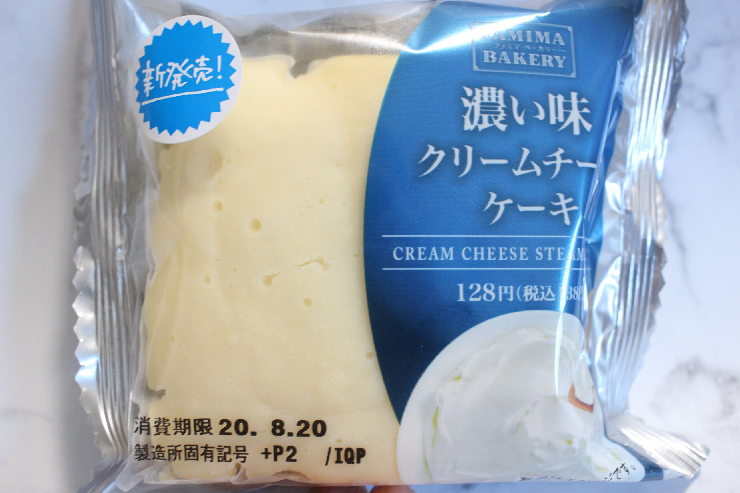 青とシルバーの配色が涼しげなパッケージ。クリームチーズを使用した濃厚な味わいのチーズ蒸しケーキです。