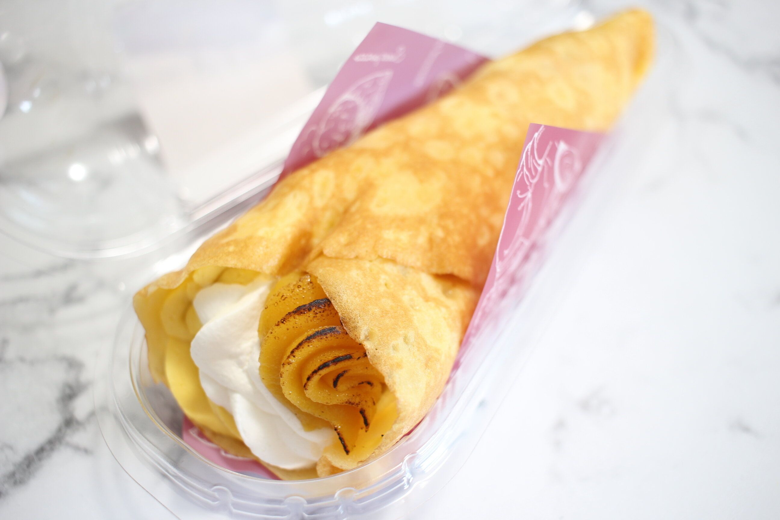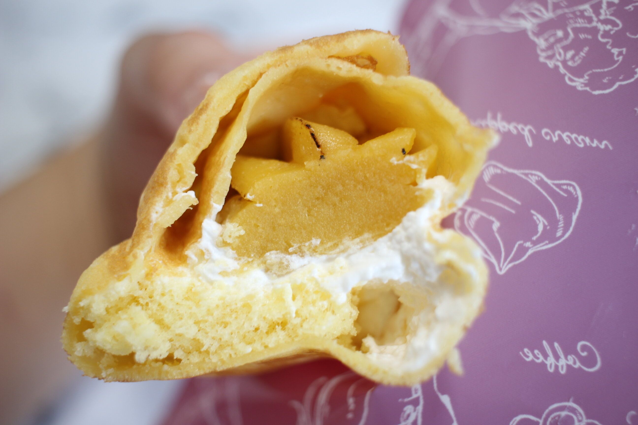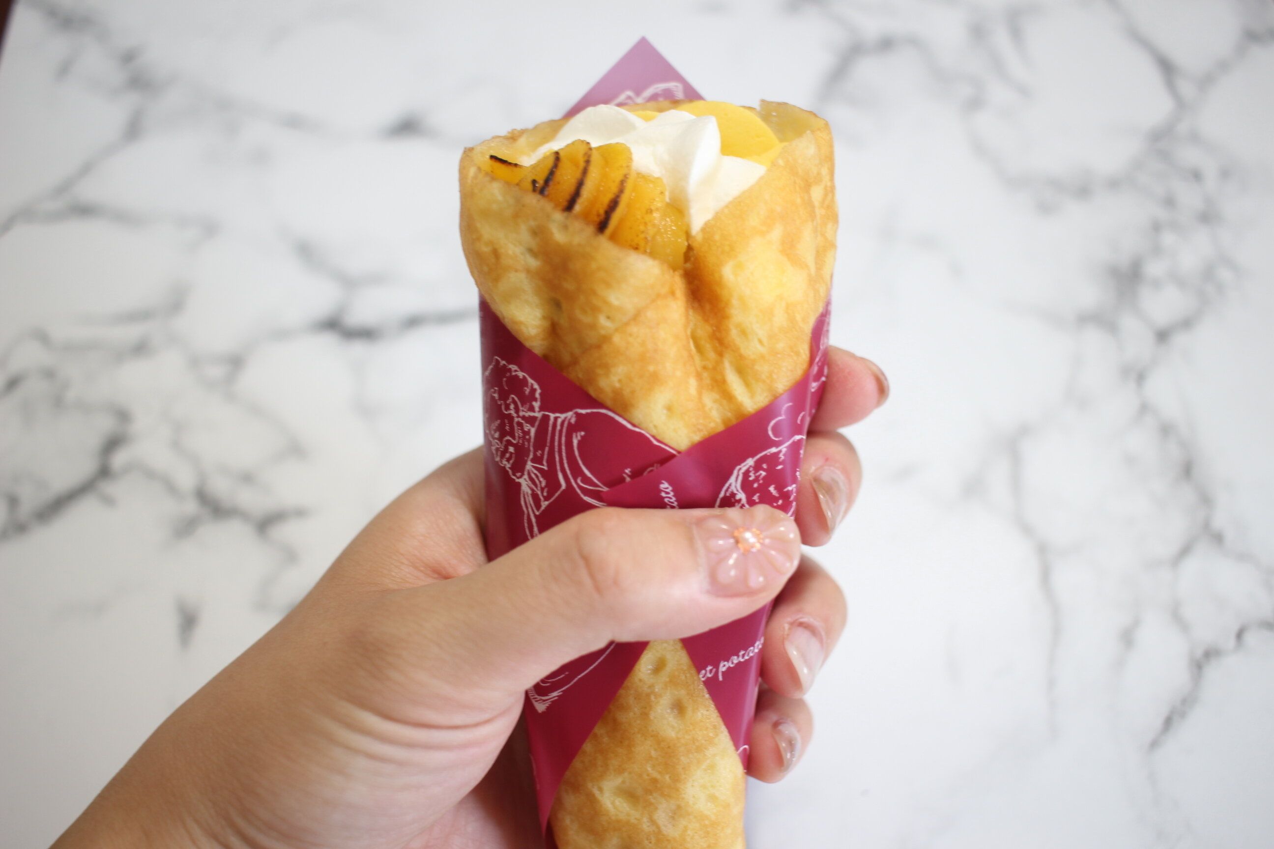 ホイップクリームと安納芋クリームと一緒にもちもちクレープで包まれています。