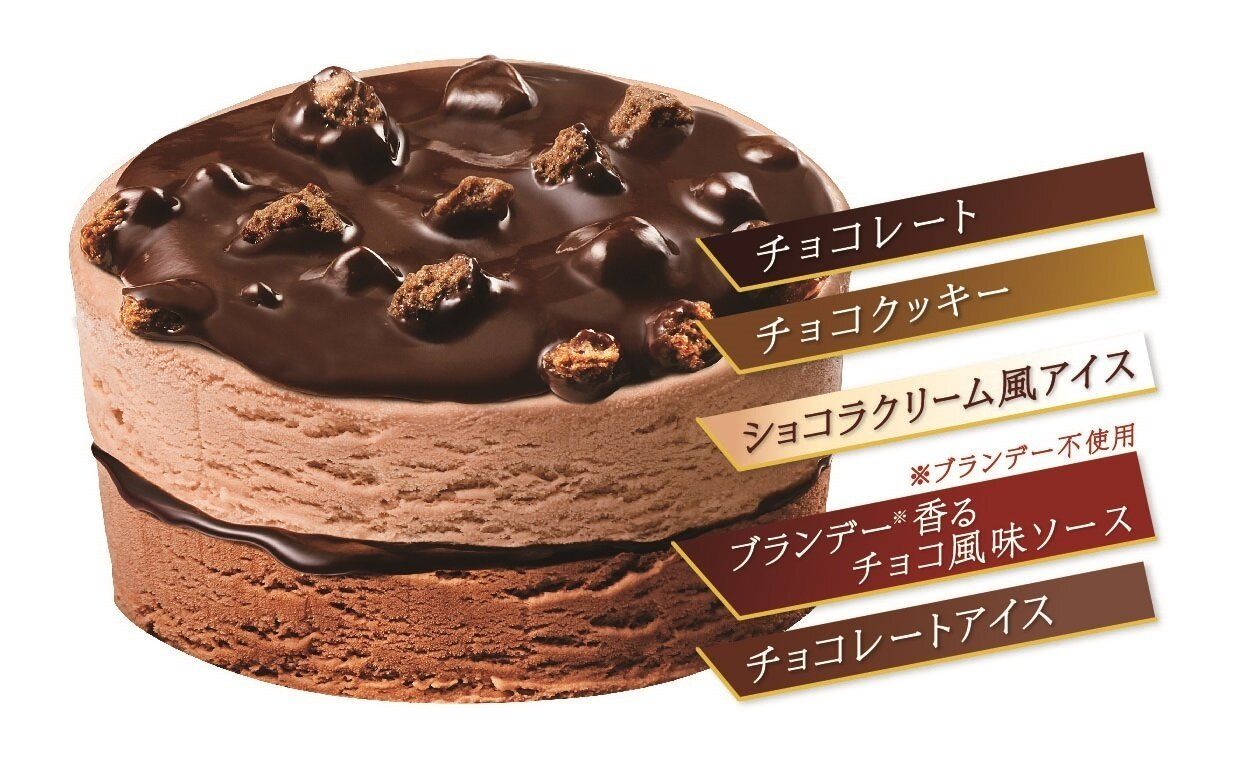 本商品は、豊潤なカカオの風味が感じられる「チョコレートアイス」と「ショコラクリーム風アイス」の間に、“とろっとした食感”の「ブランデー香る※1チョコ風味ソース」を隠し味に挟み込みました。