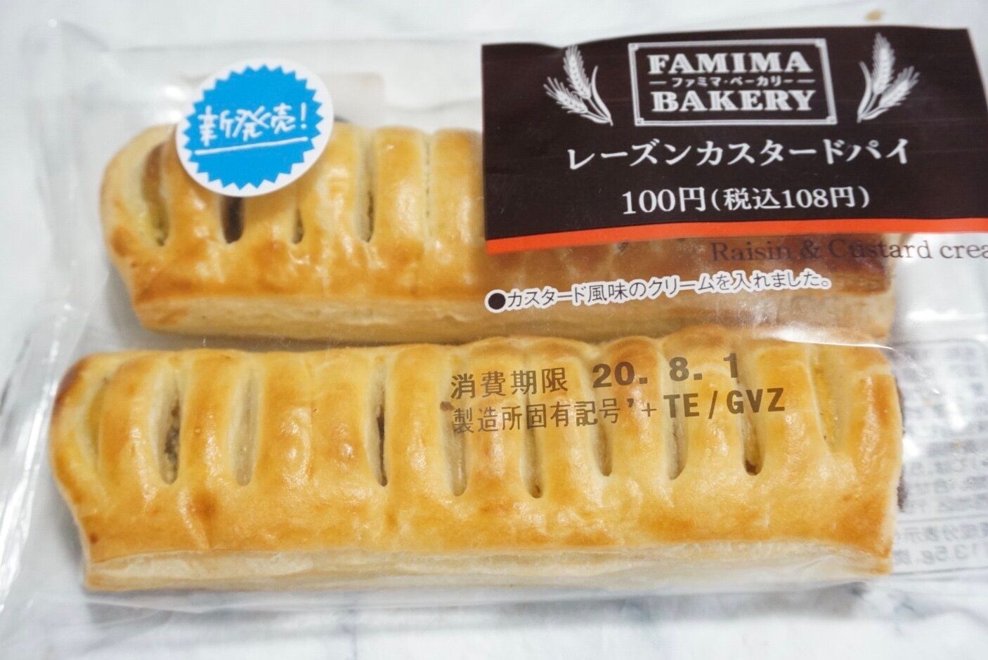 「レーズンカスタードパイ」2本入りで税抜100円です。