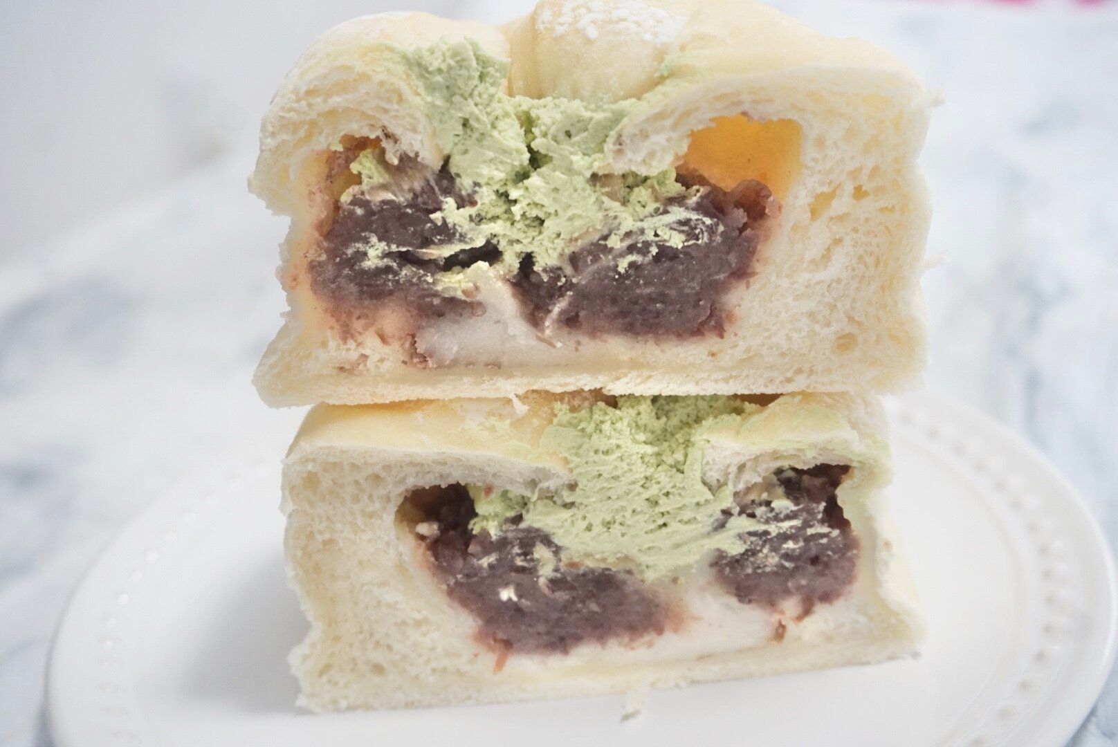 パンの真ん中には抹茶ホイップクリームが溢れていて、つぶあんがぎっしりと入っています。求肥は思ったよりも少なめな印象ですね。