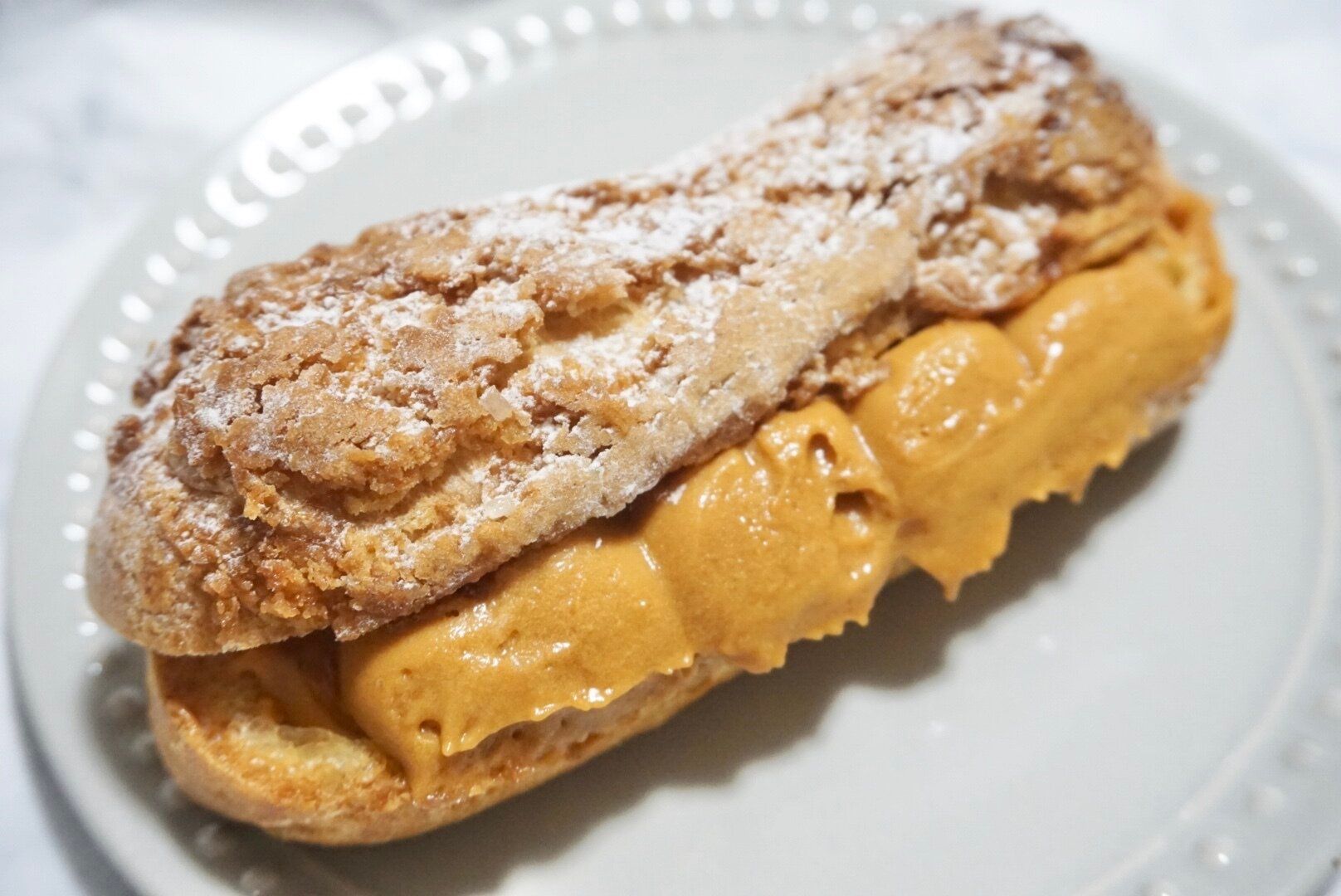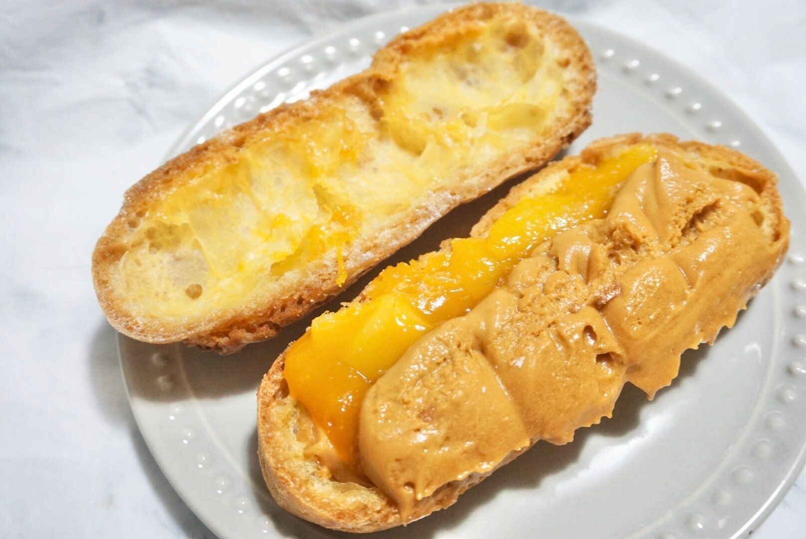 ピエール・エルメ シグネチャー エクレア マンゴーキャラメルは甘酸っぱいマンゴーの果肉、ソース、ほろ苦いキャラメルクリームを生地に詰めたエクレアです。