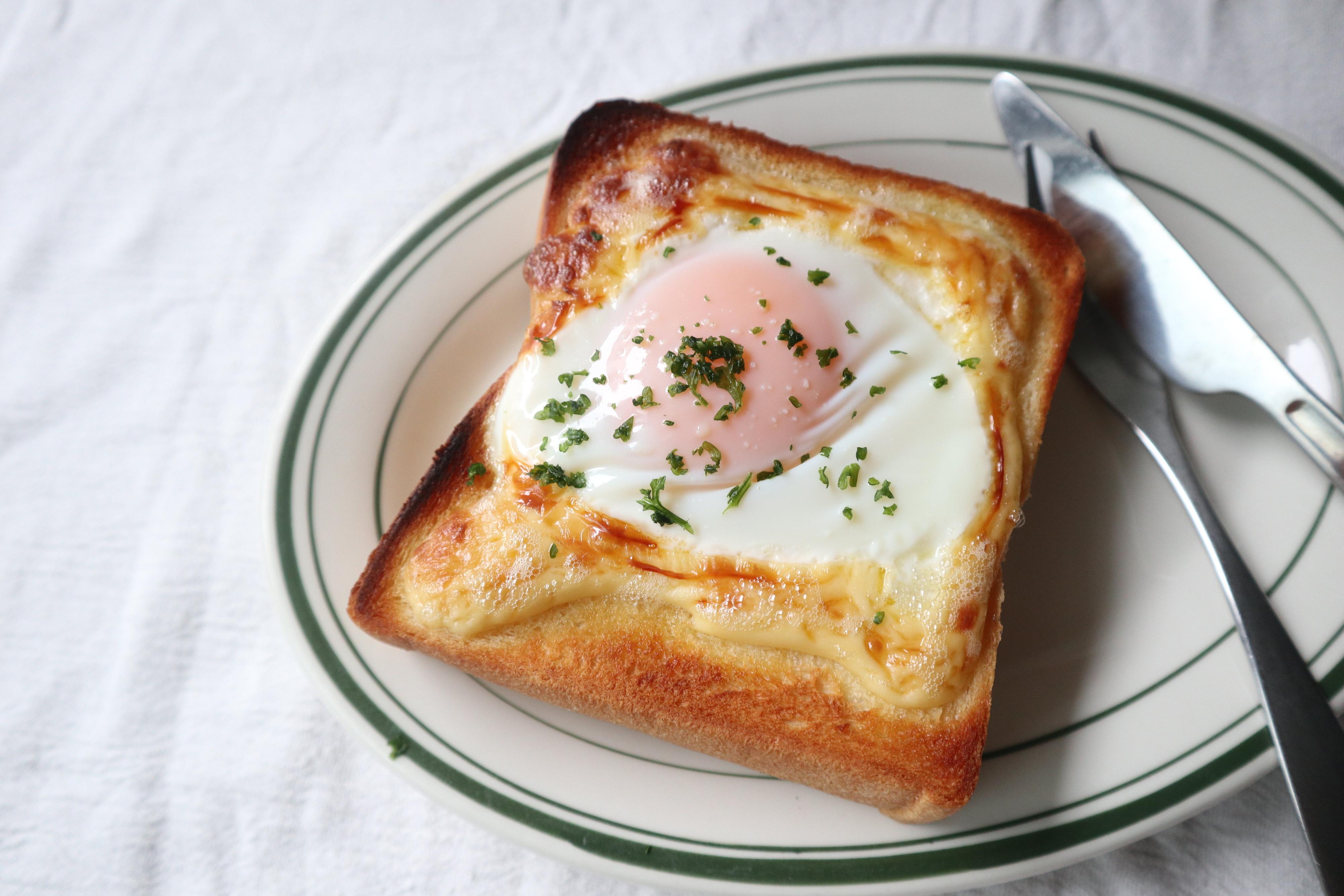 金の食パンのふちにマヨネーズを絞ります。卵が溢れないように土手の役割を果たします。真ん中に卵を落として、オーブンのトースト機能でじっくり焼きます。