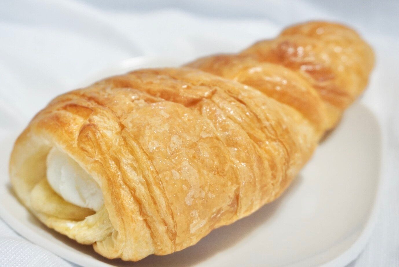 バナナシートを織り込んだデニッシュ生地に、バナナソースが入ったホイップを入れ、更にバナナチップをトッピングしたコロネです。