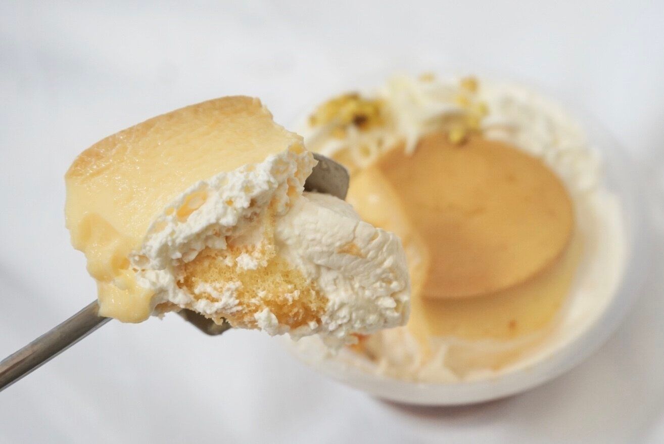 上から下までスプーンをさして一口で食べるとメープルが存分に味わえるのでおすすめ。