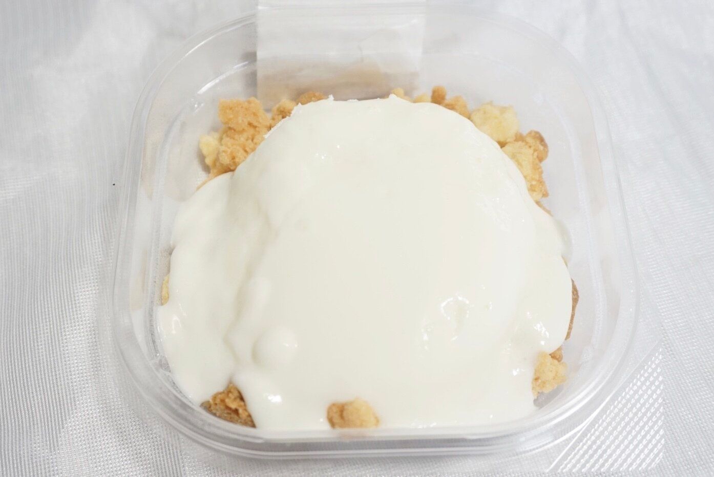 パンケーキの上にホイップととろ〜りクリームの2種がのっていて、アクセントにクランブルを敷き詰められています。