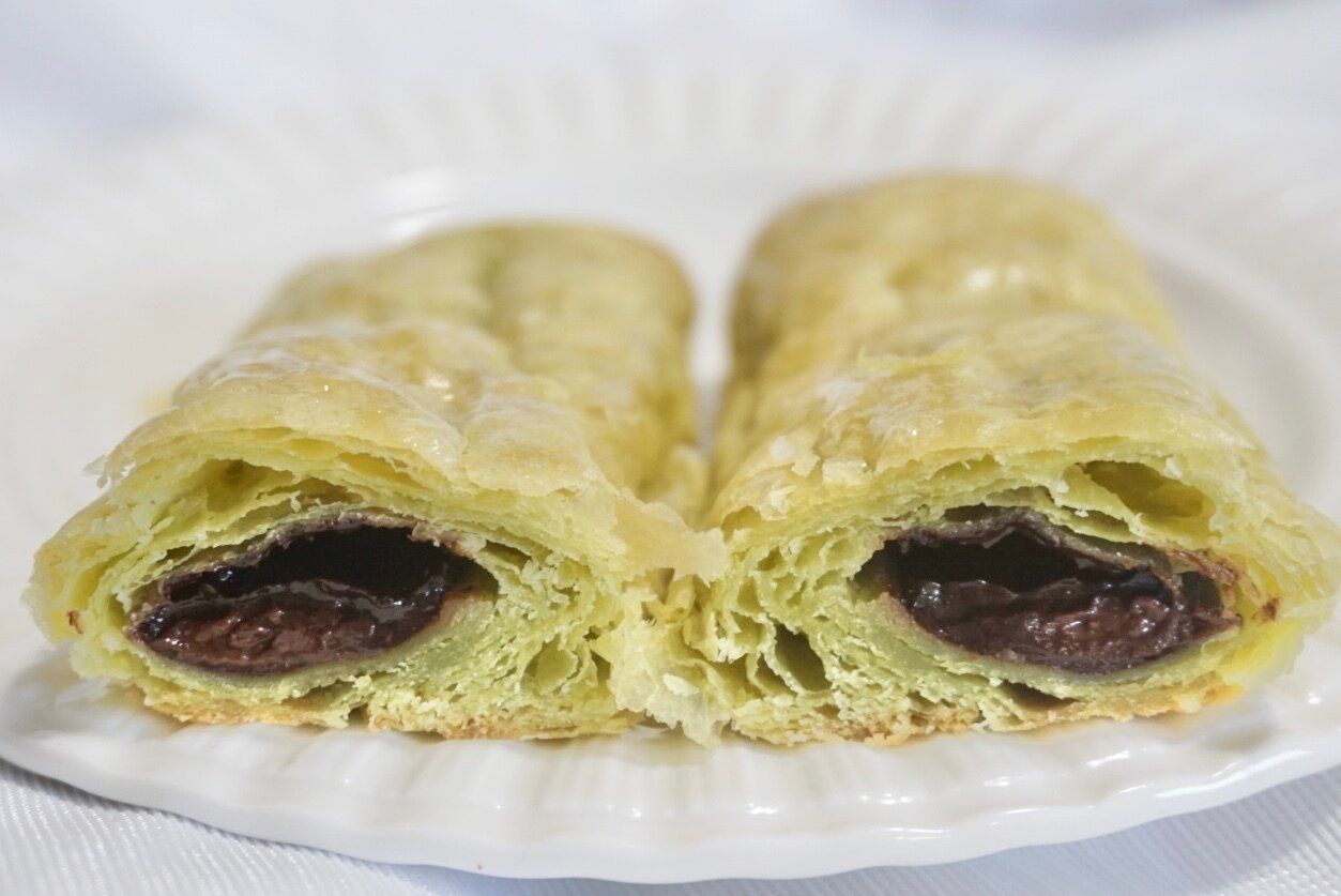 隠し味に抹茶を使用したパイ生地に、チョコクリームが包まれています。