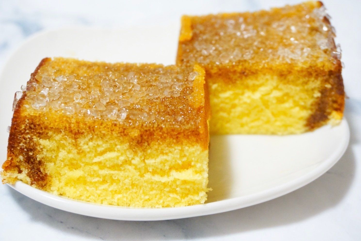 ザラメの部分をあえて側面につくっておいしい部分を増やしたカステラにシロップをかけた最高なデザート、