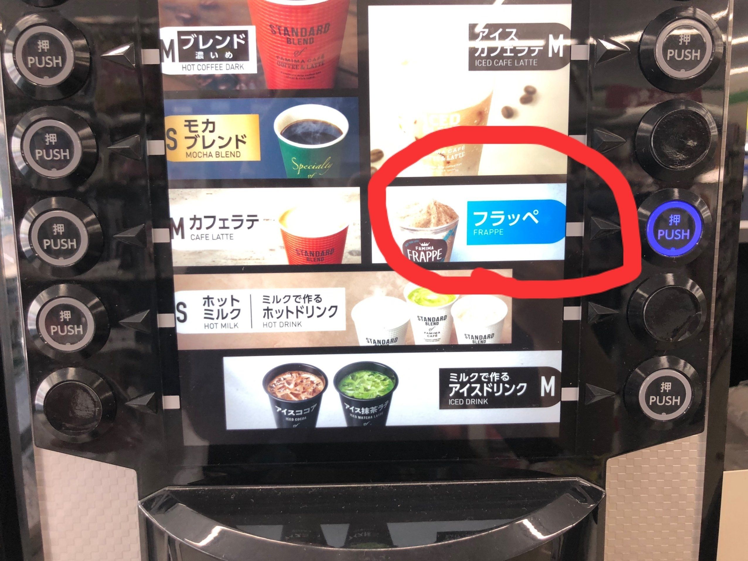次にマシーンのボタンを押します。押すのは「フラッペ」のボタン。このボタン、くれぐれもお間違いなく!