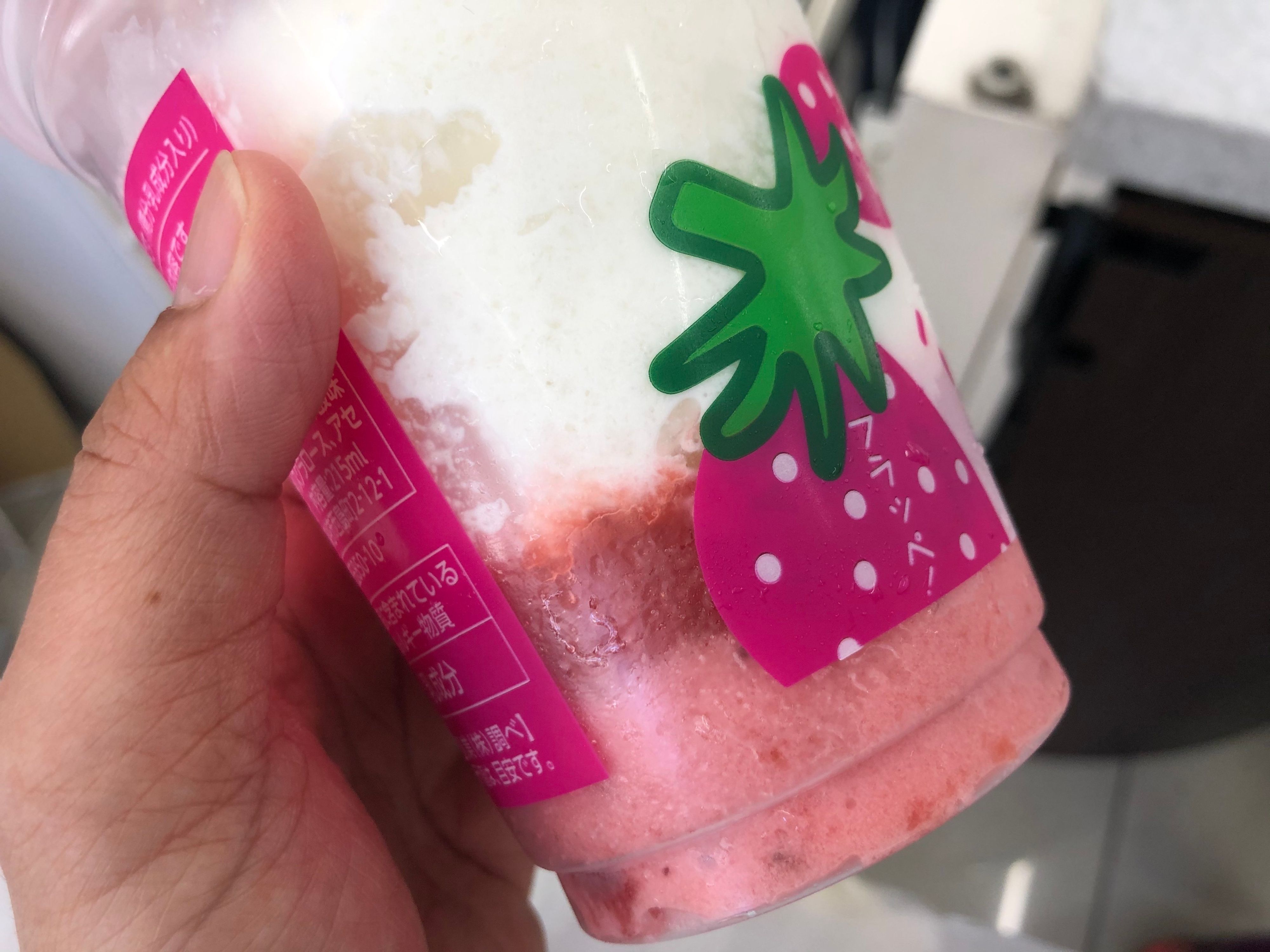 1層目が「たべる牧場ミルク」そのままのミルク氷、2層目がねっとりいちご果肉入りジェラート、1番下の3層目が粒々いちごソースです。