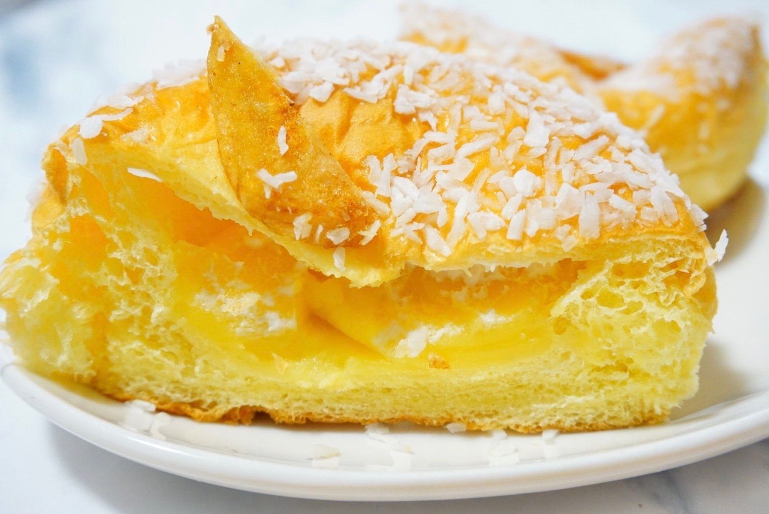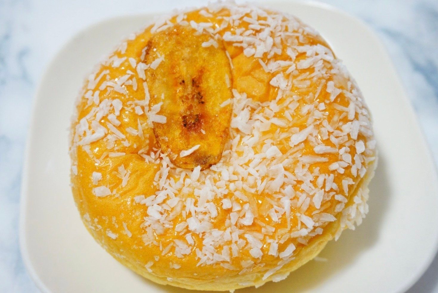 バナナクリームを包んだ生地にバナナチップをのせ焼き上げ、ココナッツをトッピングしたパンです。