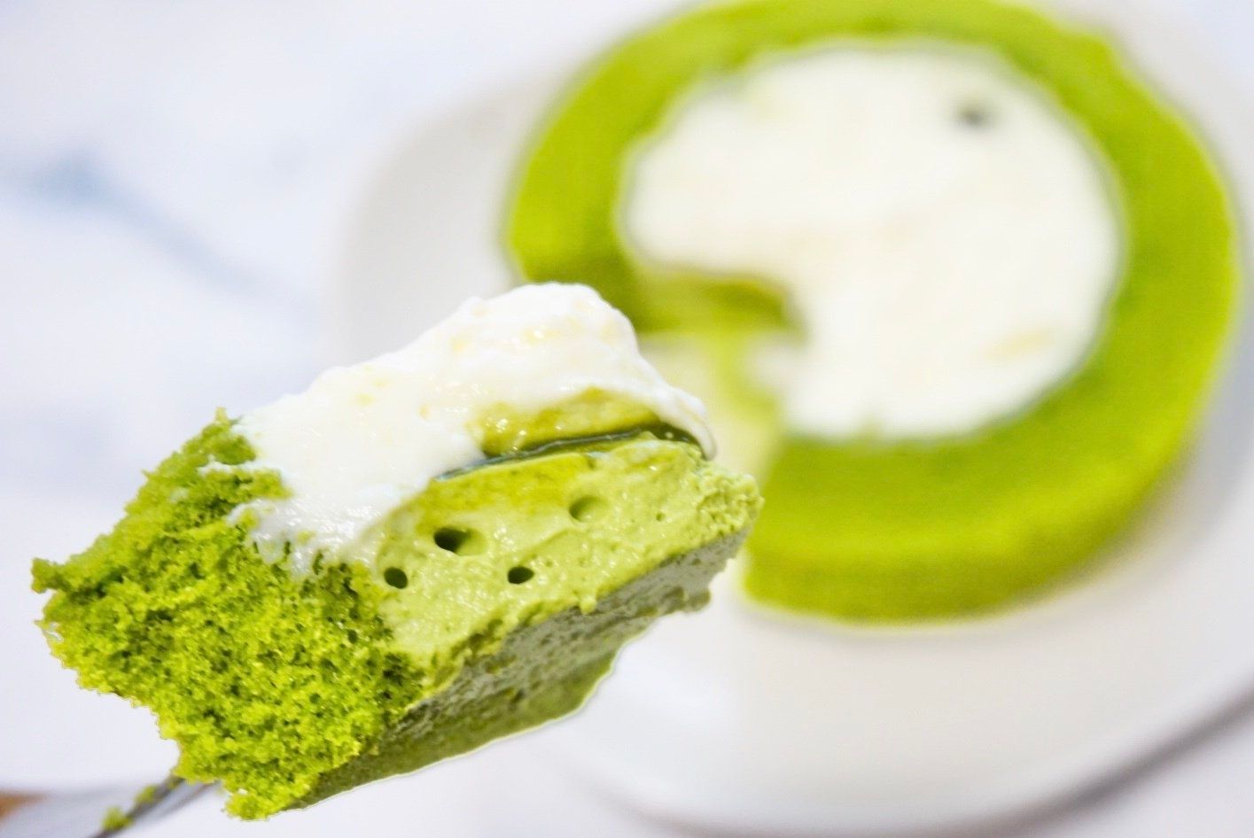 白のマスカルポーネクリーム、濃い緑の抹茶エスプレッソソース、薄い緑の抹茶クリームと抹茶ロール生地を一気にパクッ。
