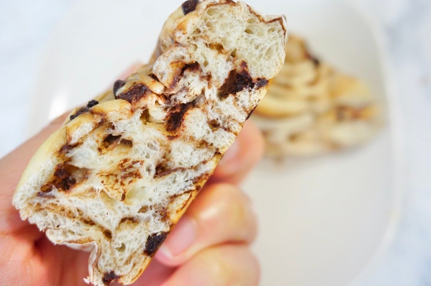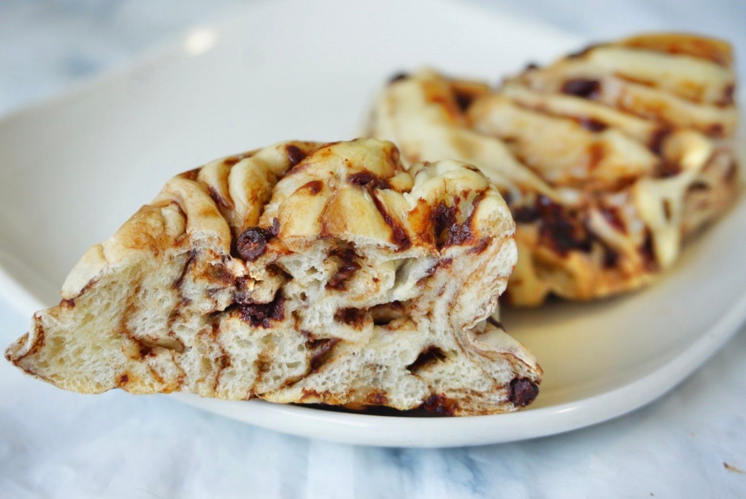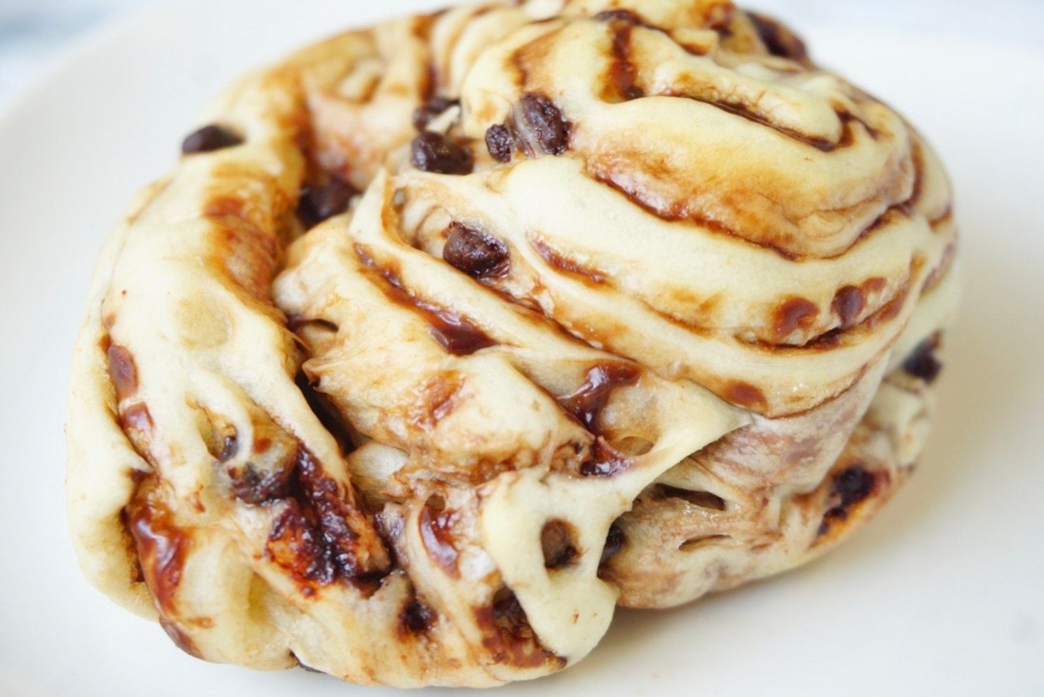 もっちチョコロールはもっちり食感の生地と濃厚なチョコを合わせたパン。ミルクチョコのシートとベルギーチョコ入りチョコチップを折り込んだパン生地を、渦巻き状に仕上げています。