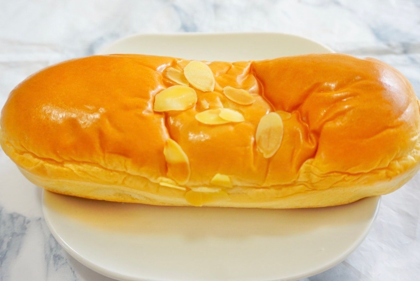 北海道産牛乳入りクリームを使用したクリームパンにスライスアーモンドがトッピングされています。