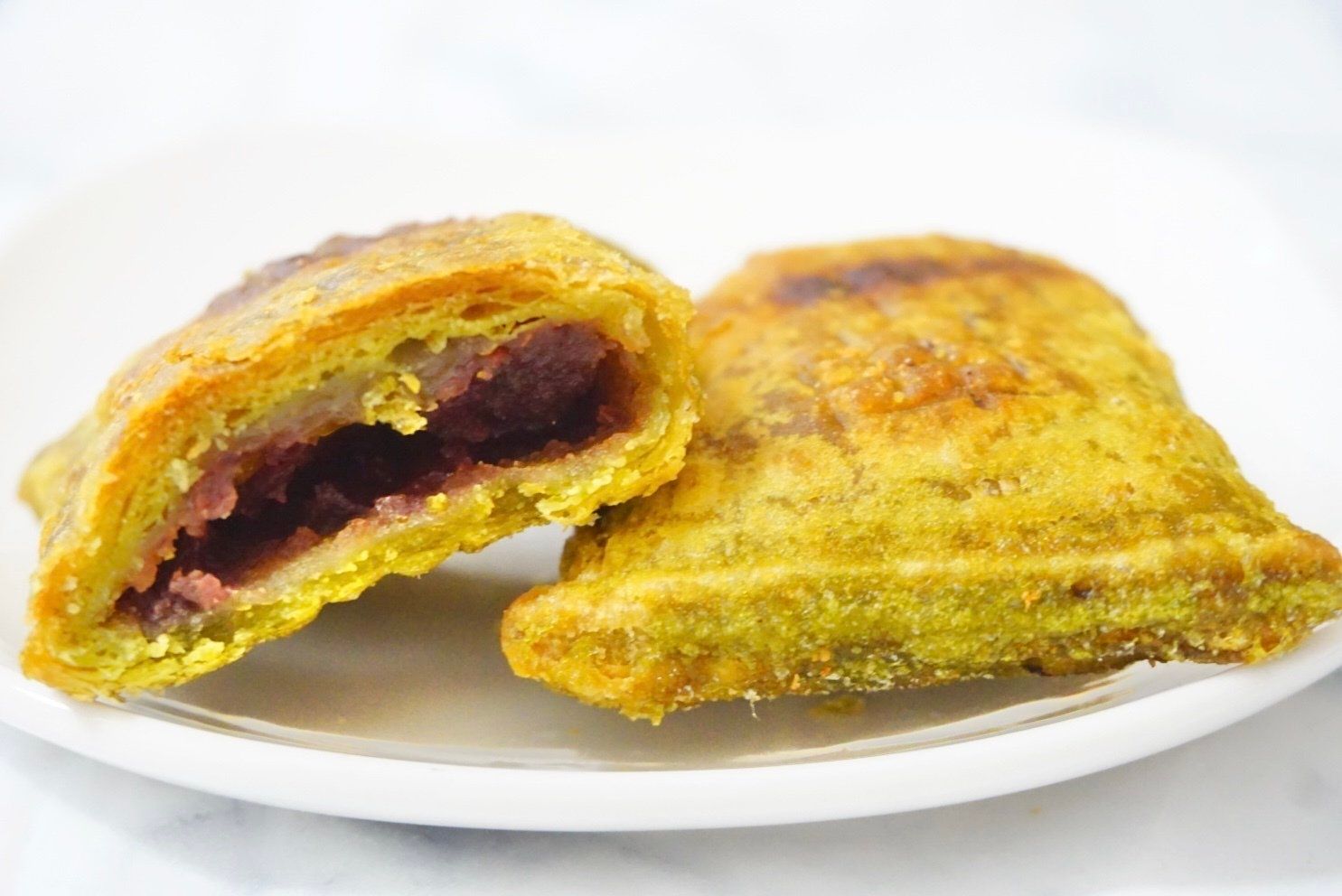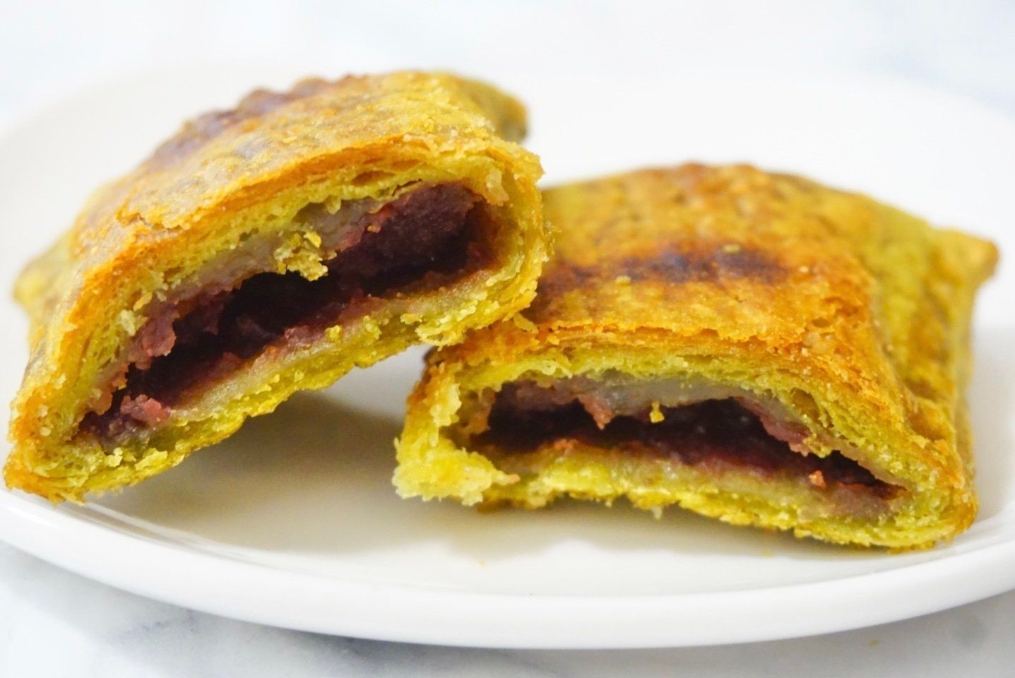 つぶあんあんと、もちフィリングを宇治抹茶入りのパイ生地で包んだ商品。