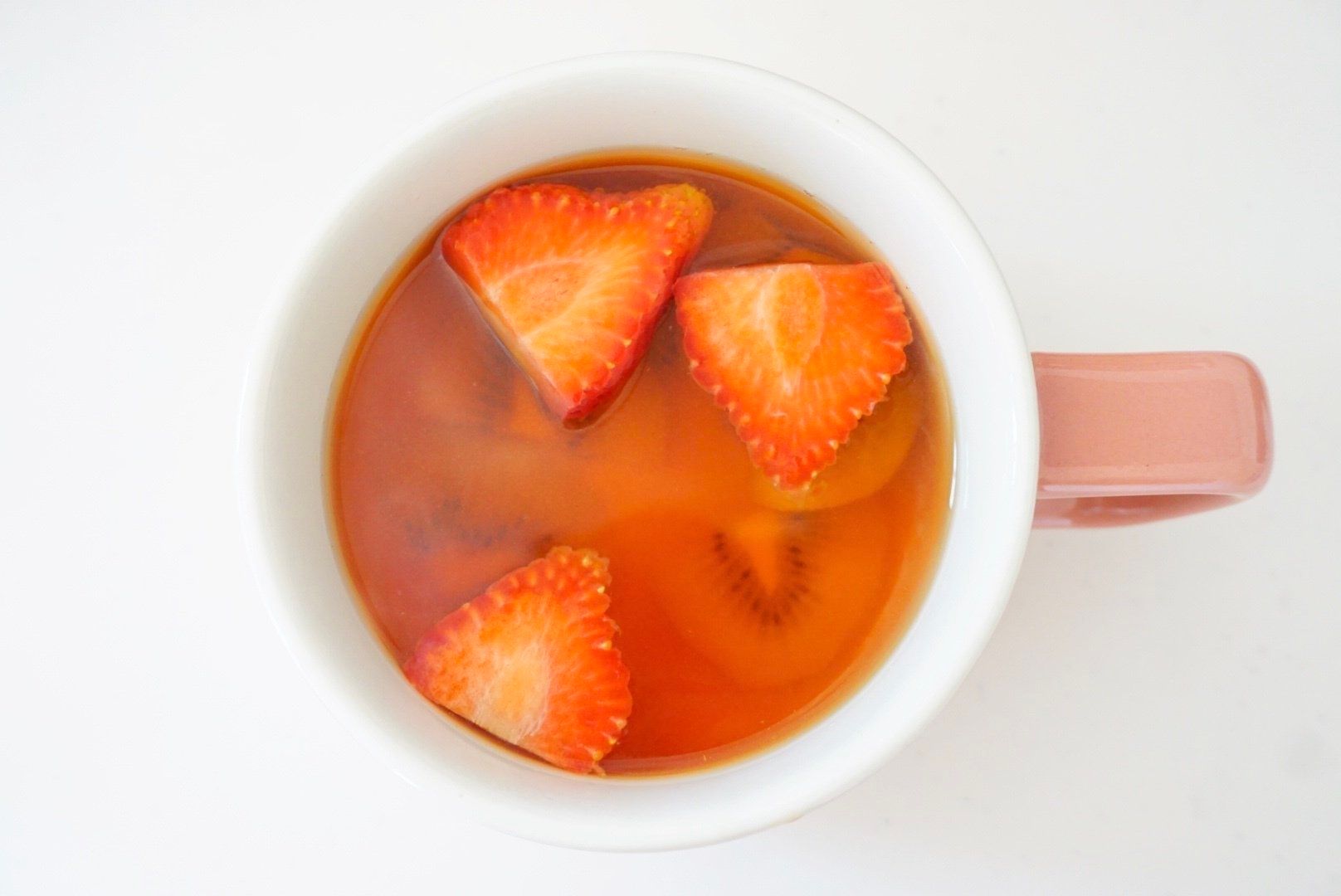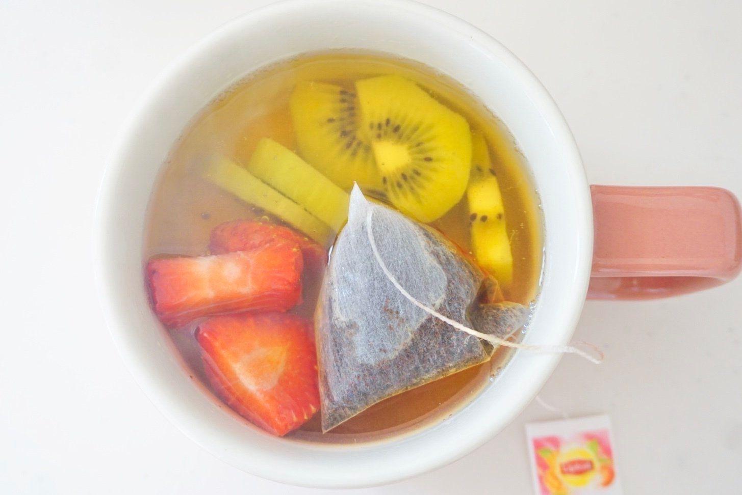 2.食べやすい大きさにカットしたフルーツとティーバッグを入れ、沸騰したてのお湯を注ぐ。(公式サイトのおすすめは長めの1分半!)