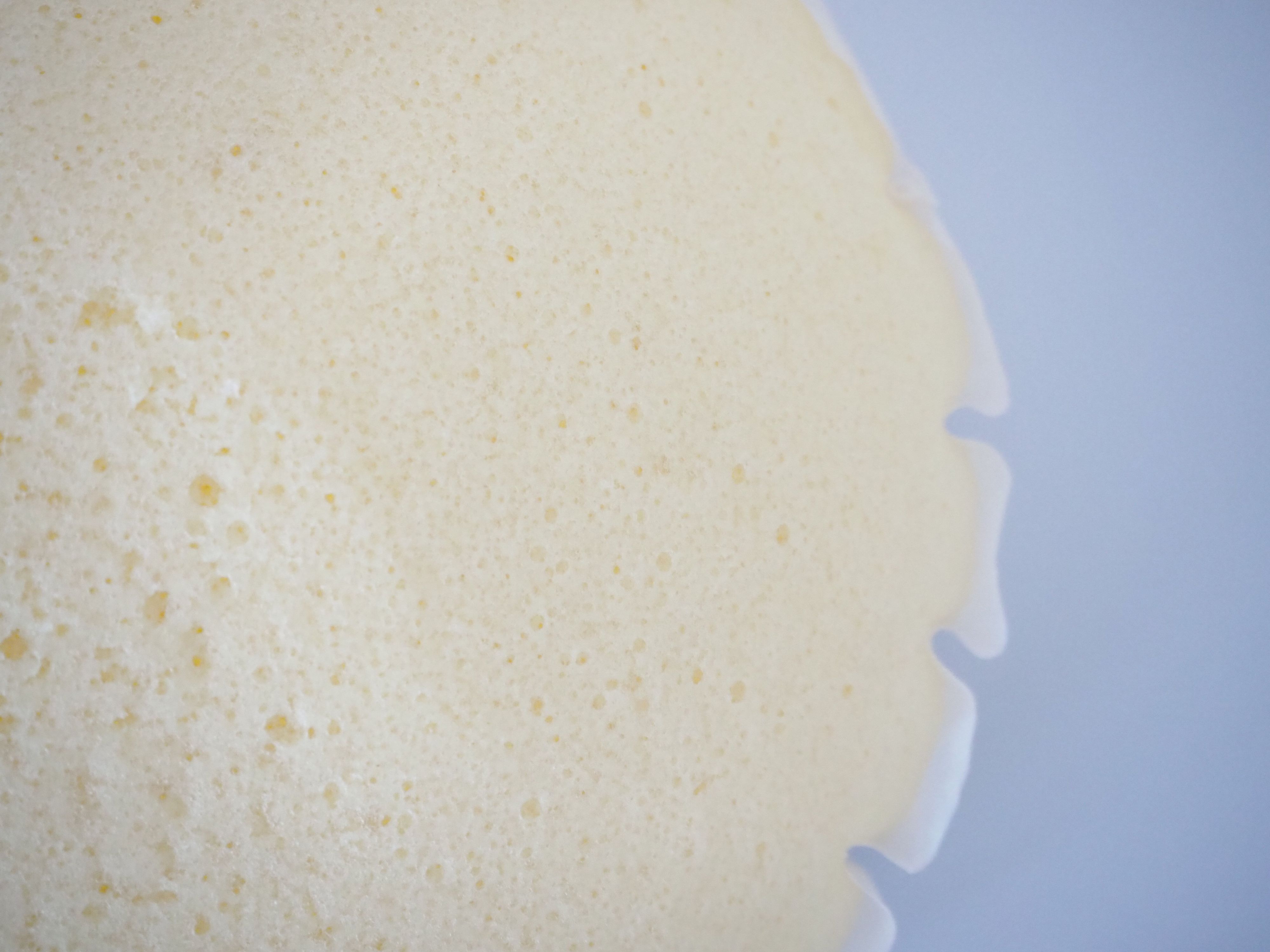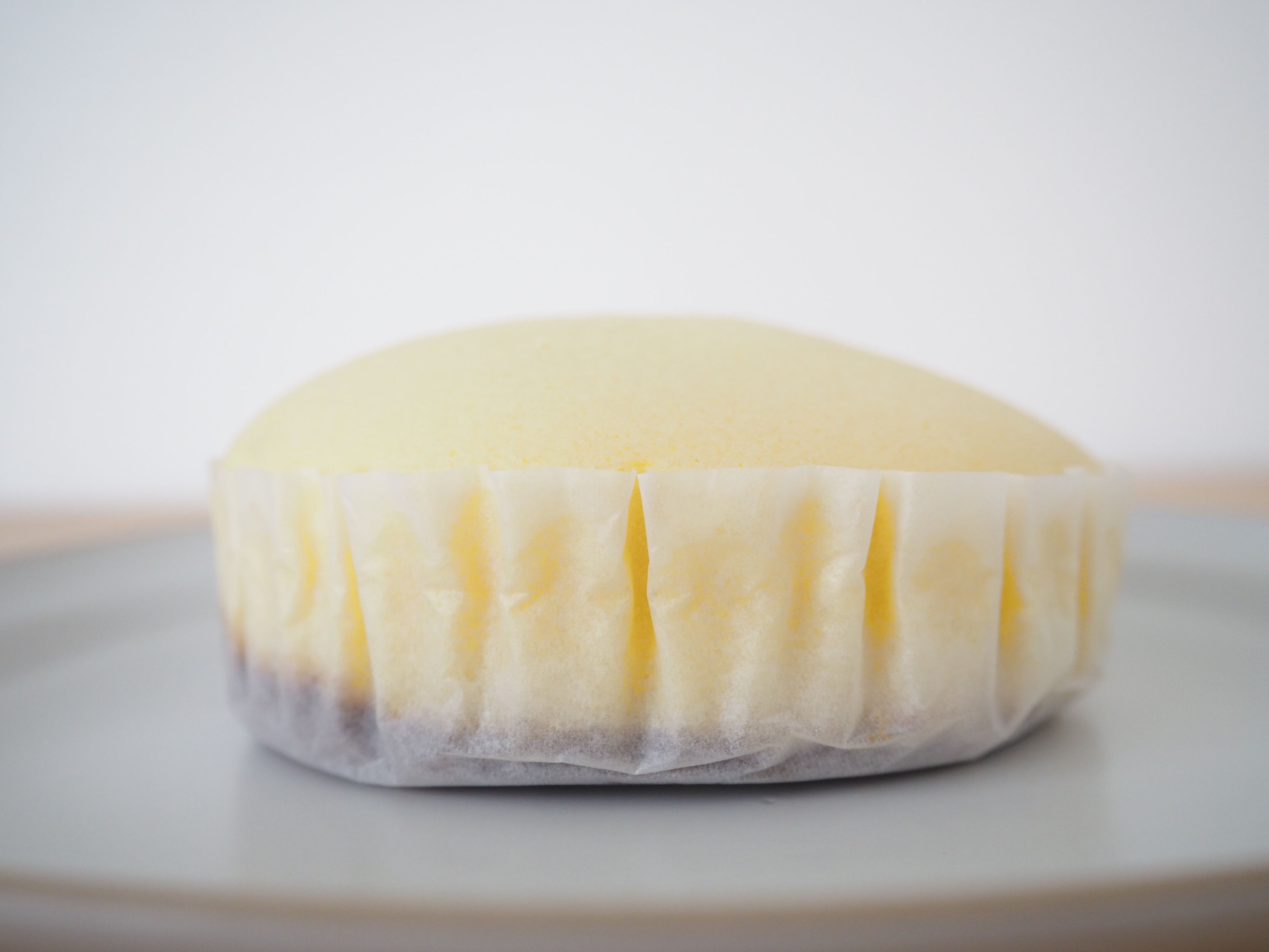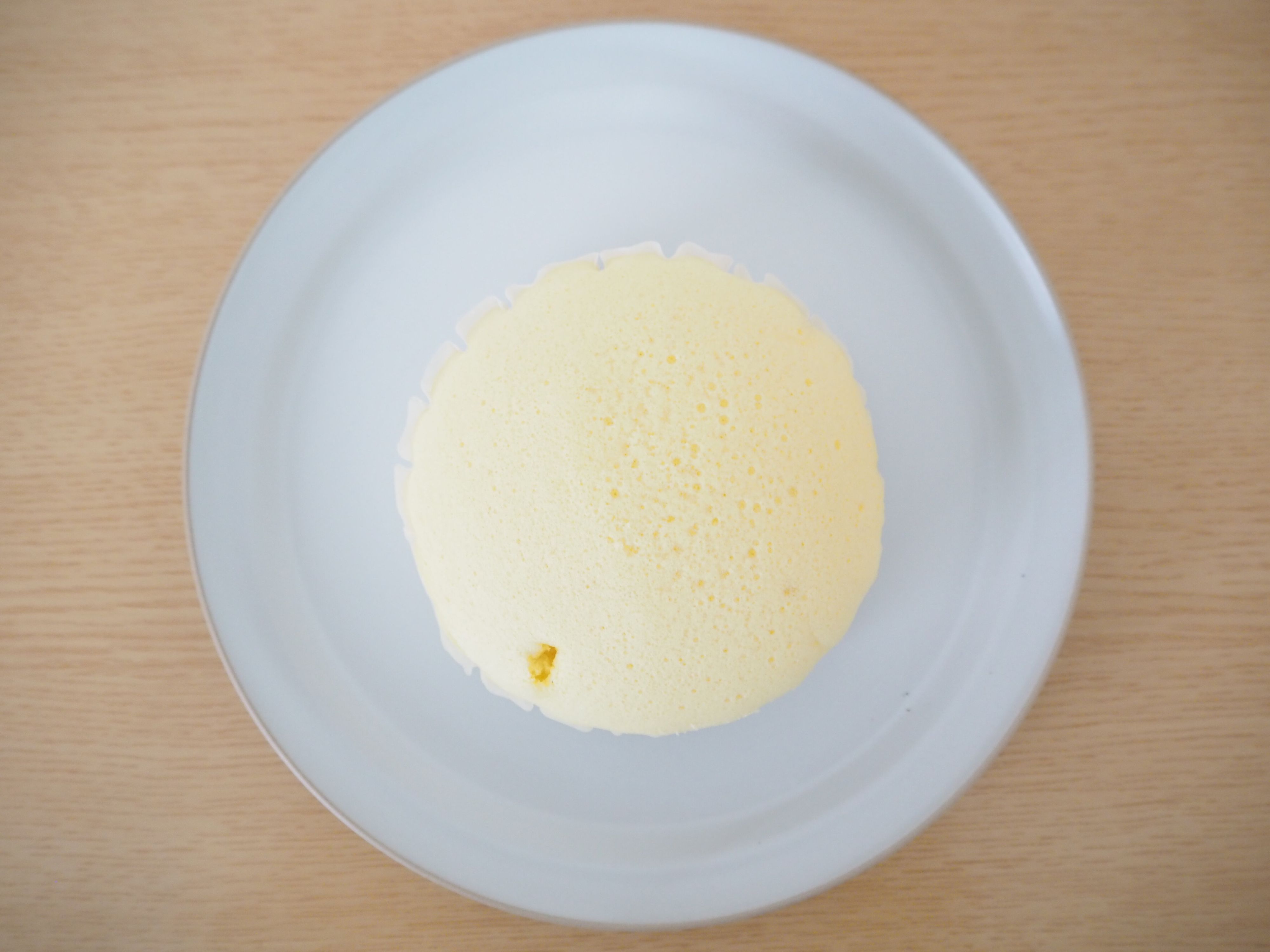 見た目はどうかというと、至って普通の蒸しケーキ。上から見るときれいな真ん丸で、蒸しケーキらしい淡い黄色をしています。