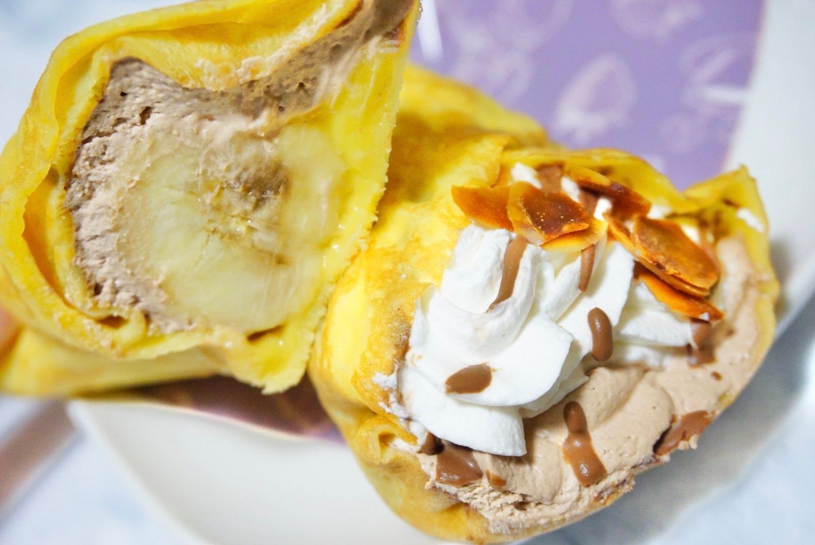 ホイップ、チョコ、バナナカスタードの3種のクリームとバナナを、もちもち生地で巻き込んだクレープです。
