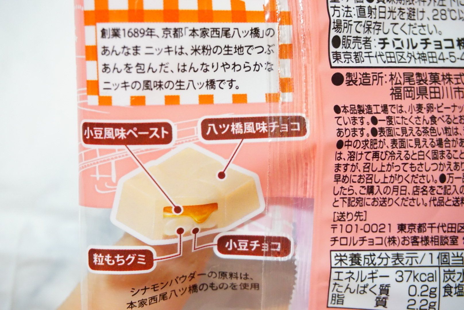 京都の本家西尾八ッ橋の、はんなり柔らかなニッキの風味の生八ッ橋をチロルチョコで再現。