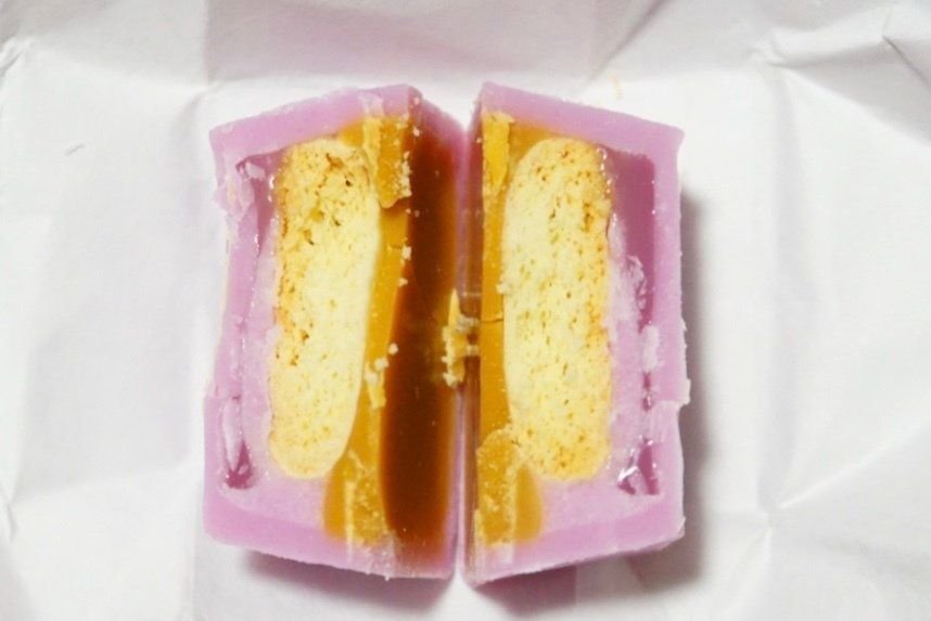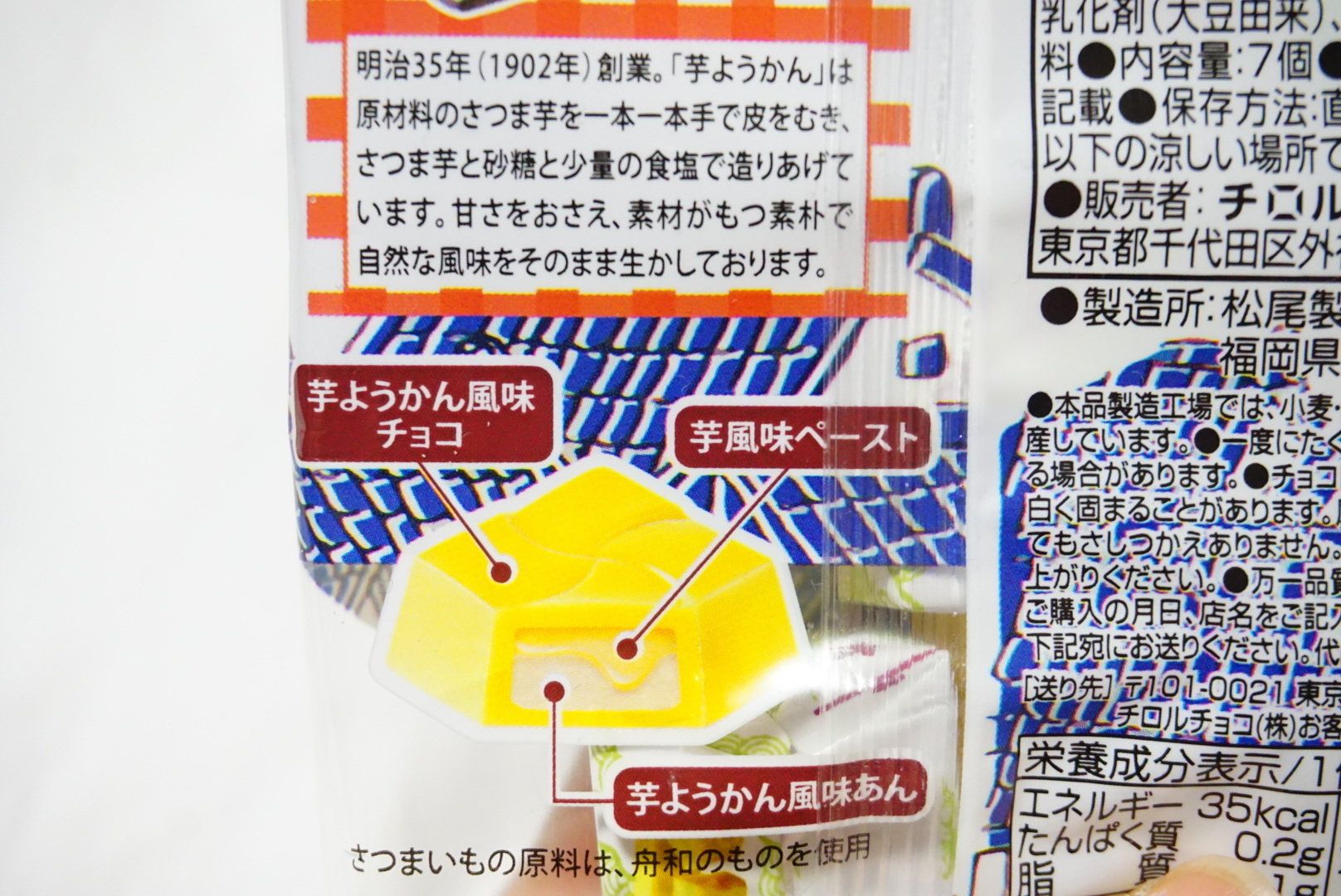 芋風味ペーストと芋ようかん風味のあんを、芋ようかん風味のチョコで包んでいて、まるで芋ようかんそのものを食べてるような再現度です。