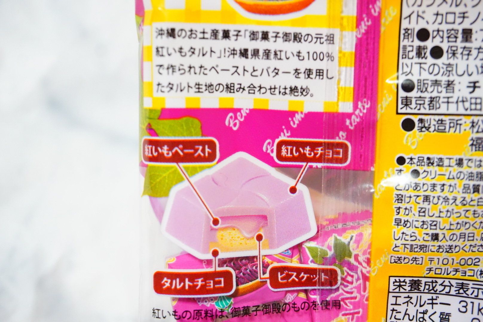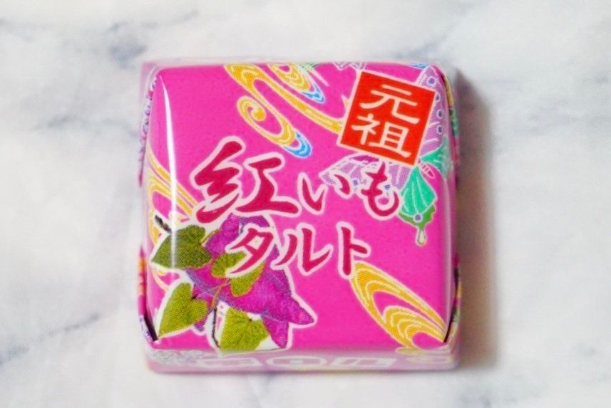 沖縄の御菓子御殿の紅いもタルト。紅いもペーストとバターを使用した絶妙な組み合わせをチロルチョコで再現。