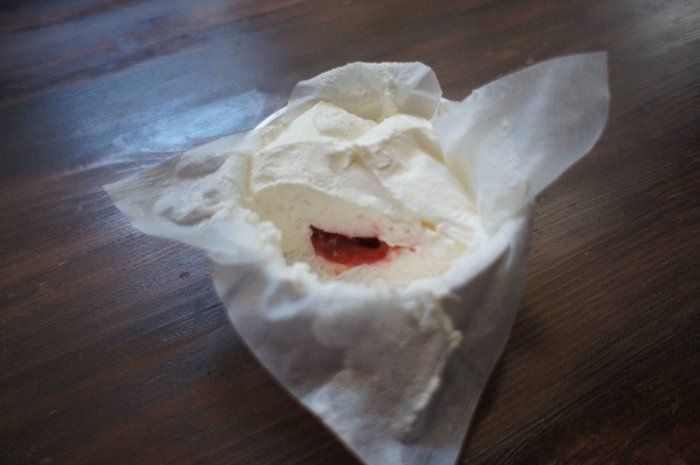 周りの布を丁寧に広げてあげると真っ白のふわふわなレアチーズが。