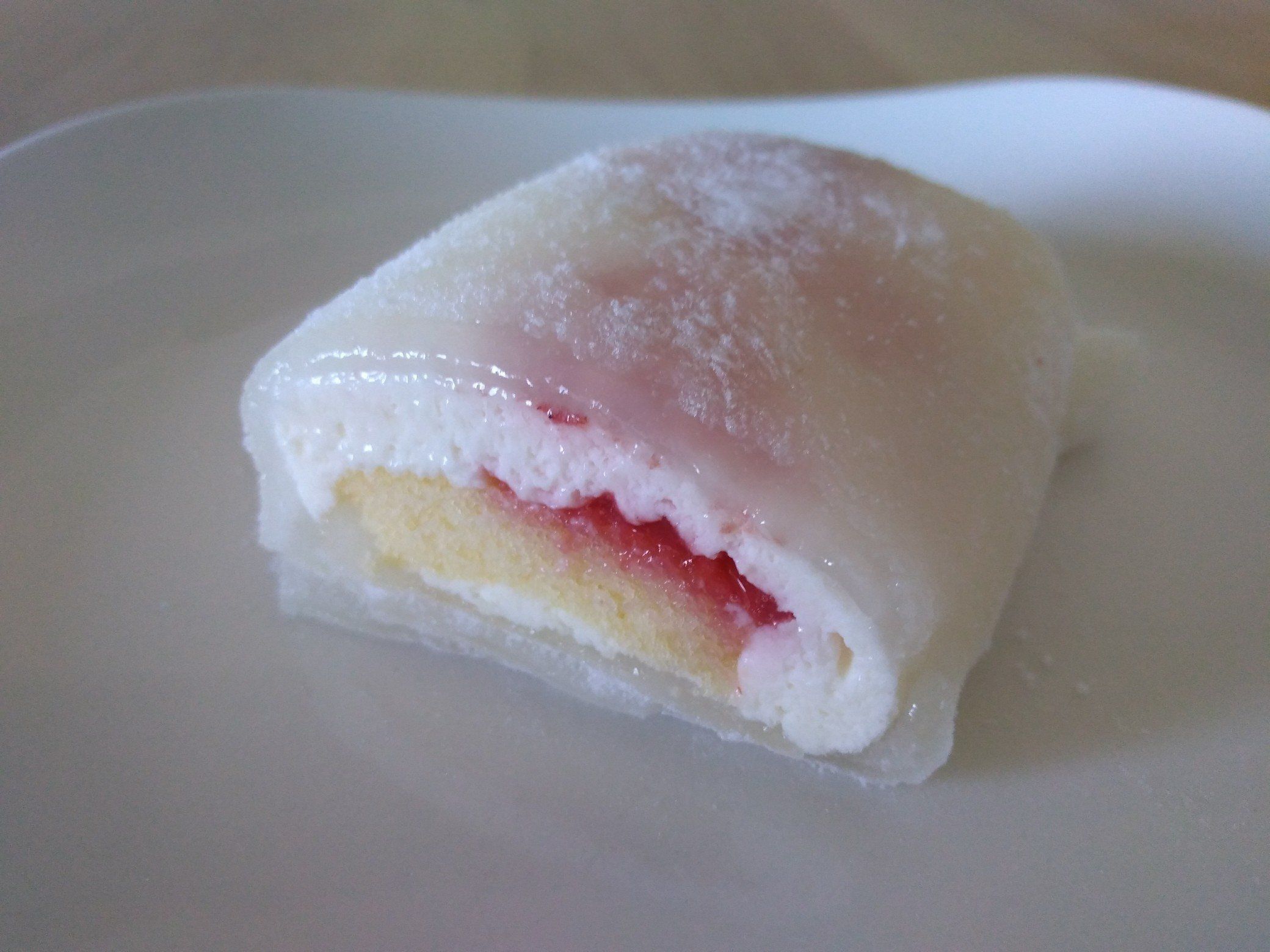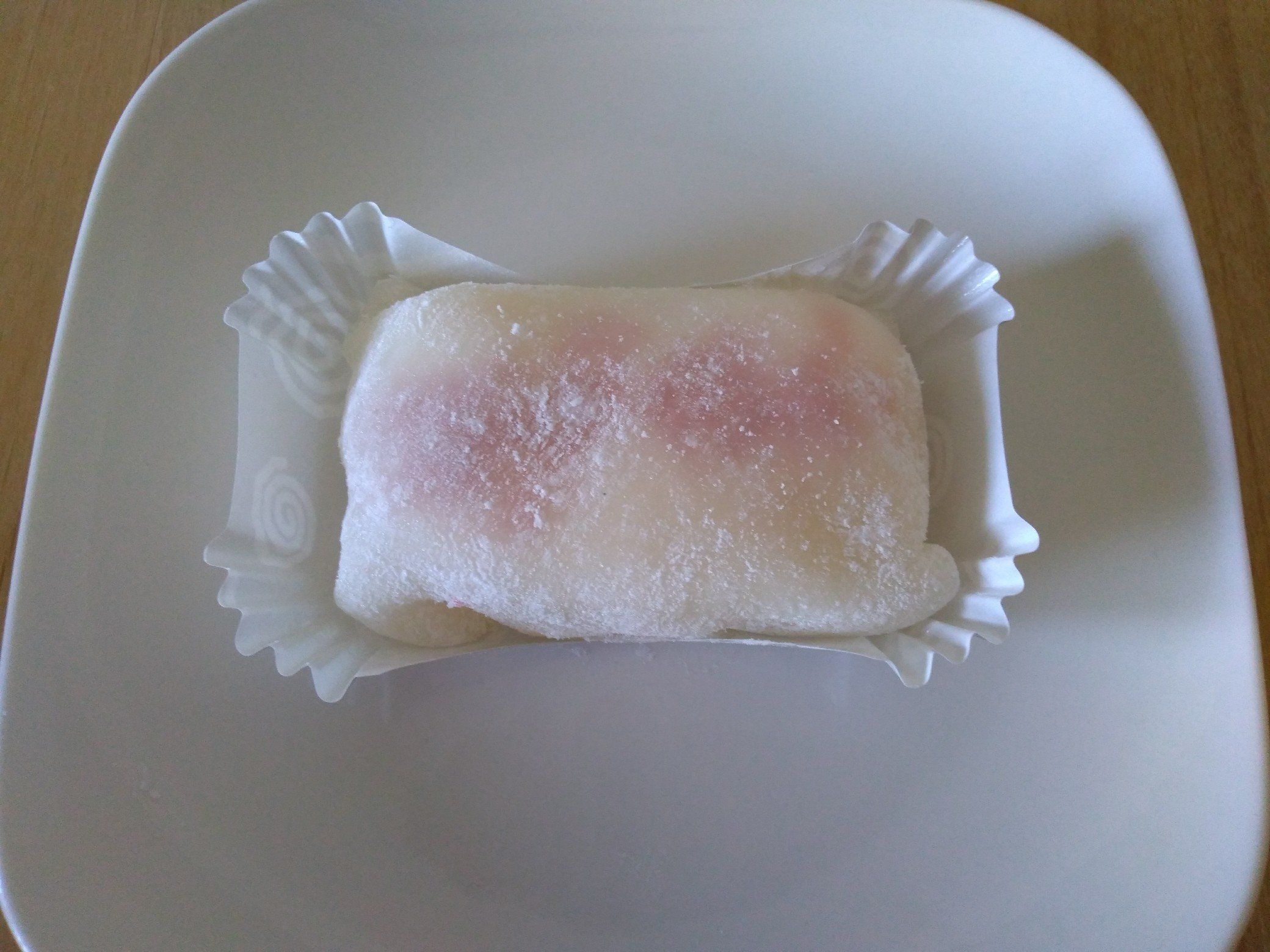 そのため、しっかりとした紙のケースの中にガードされていました。求肥から苺ソースが透けて見えて、ほんのりピンク色なところもかわいいです♪