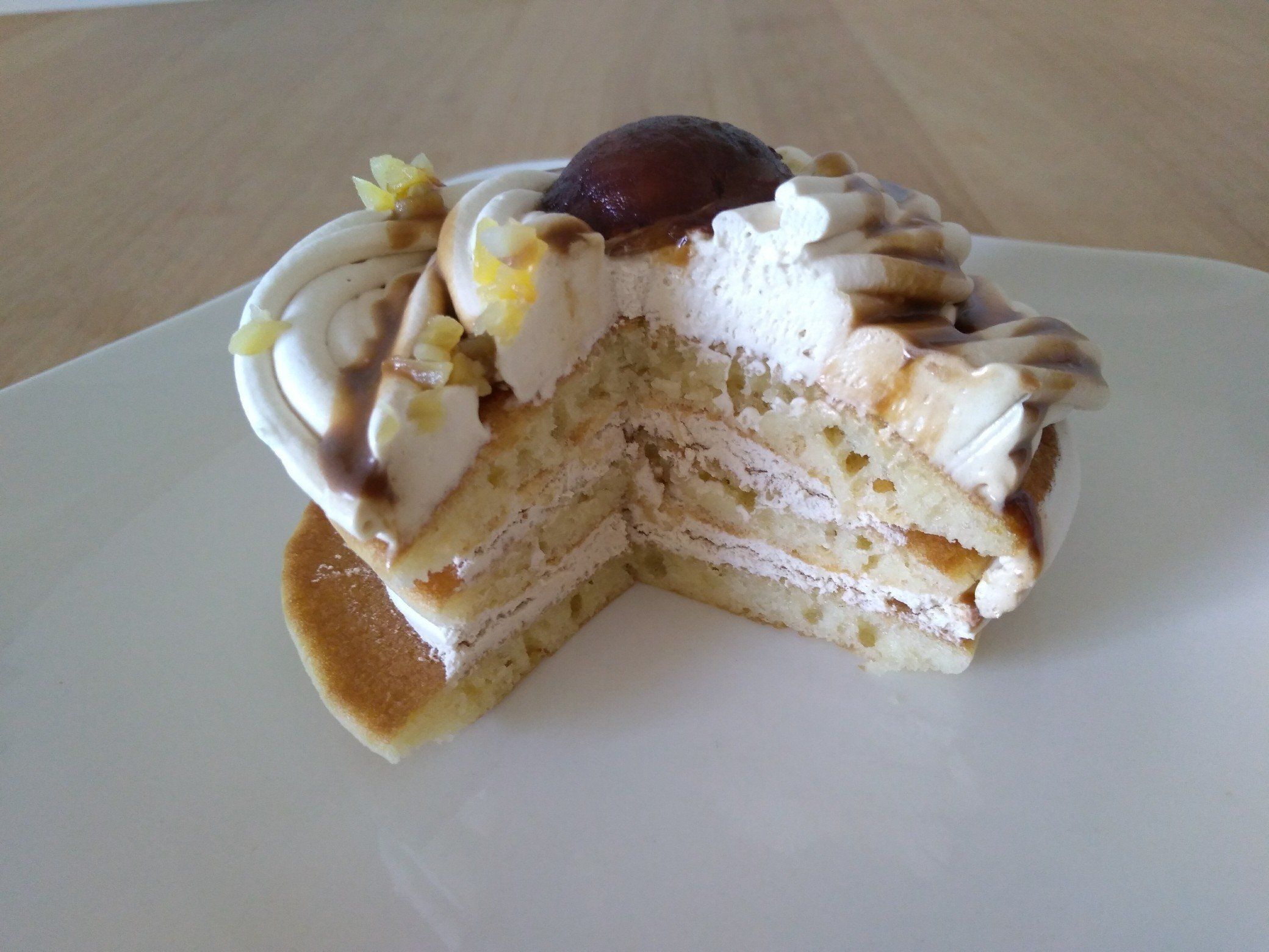 パンケーキの生地と生地の間にはマロンクリームがサンドされ、一番上にも高く盛られています。さらに、その上にマロンソースと砕かれた栗もたっぷりかけられ、てっぺんには渋皮栗がのせられています。