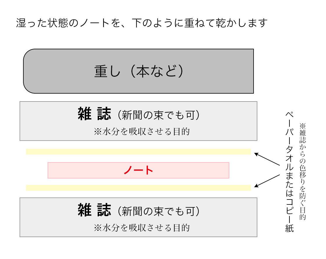 単純にドライヤー等で乾かすとシワになってしまうノートですが、ある方法で元通りに近いノートへ蘇らせることができるんだとか。