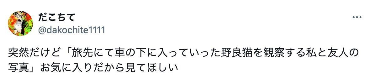 投稿したのは、友人と旅先で、車の下に入った野良猫を観察していたときの写真。